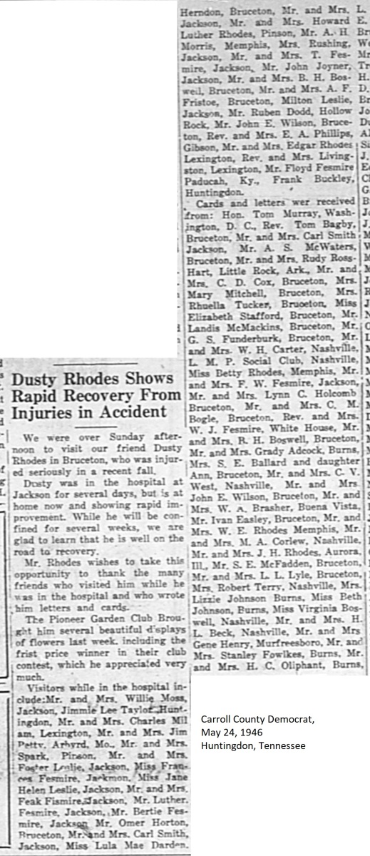Carroll County Democrat 1946 Newspaper Clippings, Surnames M-Z Carroll County, TNGenWeb Images may not display in alphabetical order. Use the Back and Next buttons below the image window to navigate. Rhodes-Dusty_Carroll-County-Democrat-May-24-1946-Huntingdon-Tennessee Image 39 of 56