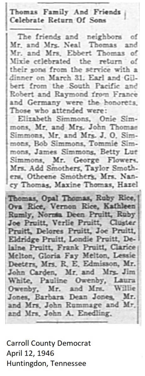 Carroll County Democrat 1946 Newspaper Clippings, Surnames M-Z Carroll County, TNGenWeb Images may not display in alphabetical order. Use the Back and Next buttons below the image window to navigate. Thomas-Family-Reunion_Carroll-County-Democrat-April-12-1946-Huntingdon-Tennessee Image 41 of 56