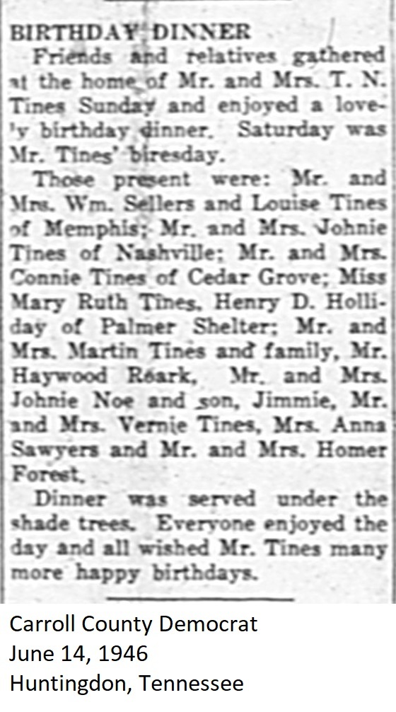 Carroll County Democrat 1946 Newspaper Clippings, Surnames M-Z Carroll County, TNGenWeb Images may not display in alphabetical order. Use the Back and Next buttons below the image window to navigate. Tines-T.-N.-Birthday_Carroll-County-Democrat-June-14-1946-Huntingdon-Tennessee Image 45 of 56