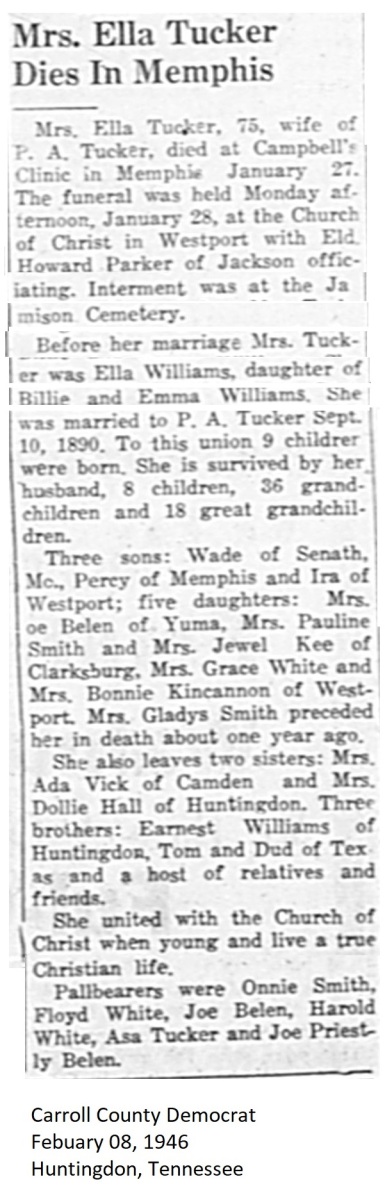 Carroll County Democrat 1946 Newspaper Clippings, Surnames M-Z Carroll County, TNGenWeb Images may not display in alphabetical order. Use the Back and Next buttons below the image window to navigate. Tucker-Ella_Carroll-County-Democrat-February-08-1946-Huntingdon-Tennessee Image 47 of 56