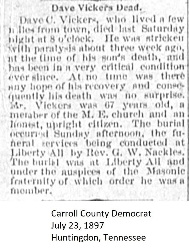 Carroll County Democrat Newspaper Clippings 1897, Surnames T-Z Carroll County, TNGenWeb Images may not display in alphabetical order. Use the Back and Next buttons below the image window to navigate. Vickers-Dave-C._Carroll-County-Democrat-July-23-1897-Huntingdon-Tennessee Image 14 of 45