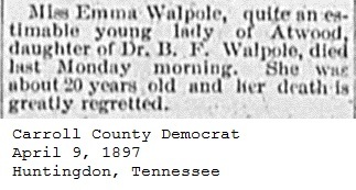 Carroll County Democrat Newspaper Clippings 1897, Surnames T-Z Carroll County, TNGenWeb Images may not display in alphabetical order. Use the Back and Next buttons below the image window to navigate. Walpole-Emma_Carroll-County-Democrat-April-9-1897-Huntingdon-Tennessee Image 16 of 45