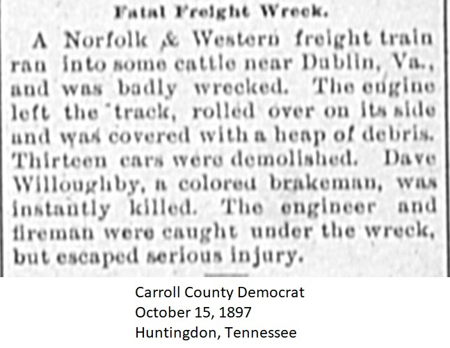 Carroll County Democrat Newspaper Clippings 1897, Surnames T-Z Carroll County, TNGenWeb Images may not display in alphabetical order. Use the Back and Next buttons below the image window to navigate. Willoughby-Dave_Carroll-County-Democrat-October-15-1897-Huntingdon-Tennessee Image 34 of 45