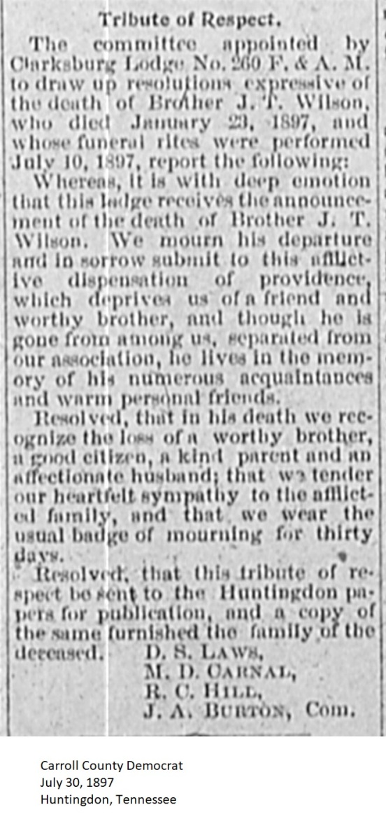 Carroll County Democrat Newspaper Clippings 1897, Surnames T-Z Carroll County, TNGenWeb Images may not display in alphabetical order. Use the Back and Next buttons below the image window to navigate. Wilson-J.-T._Carroll-County-Democrat-July-30-1897-Huntingdon-Tennessee Image 37 of 45