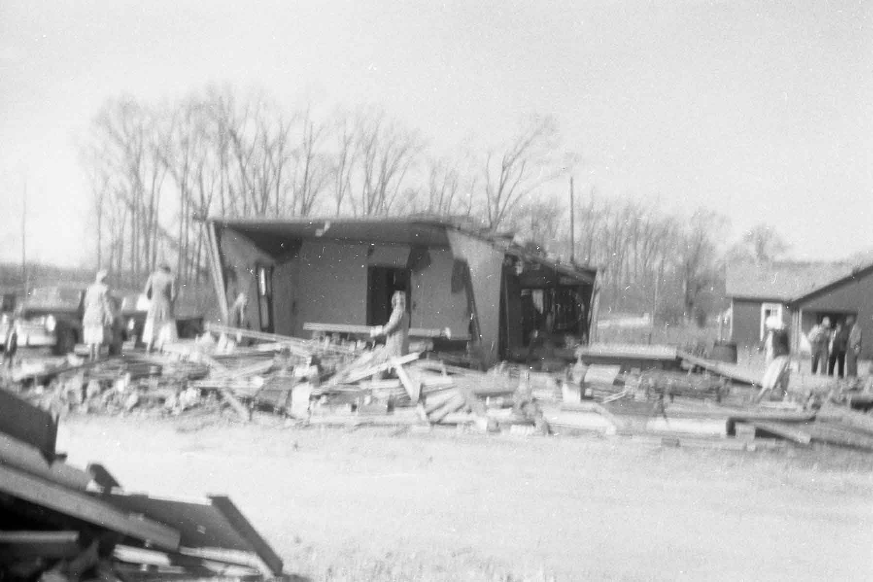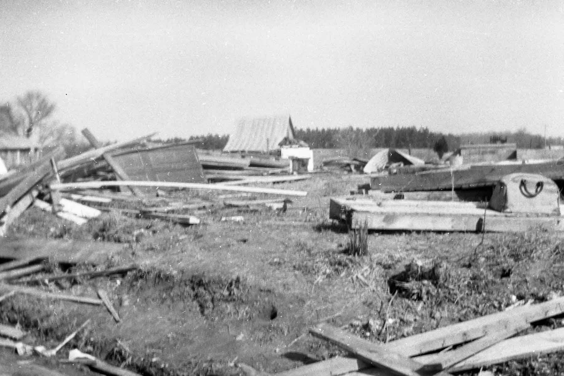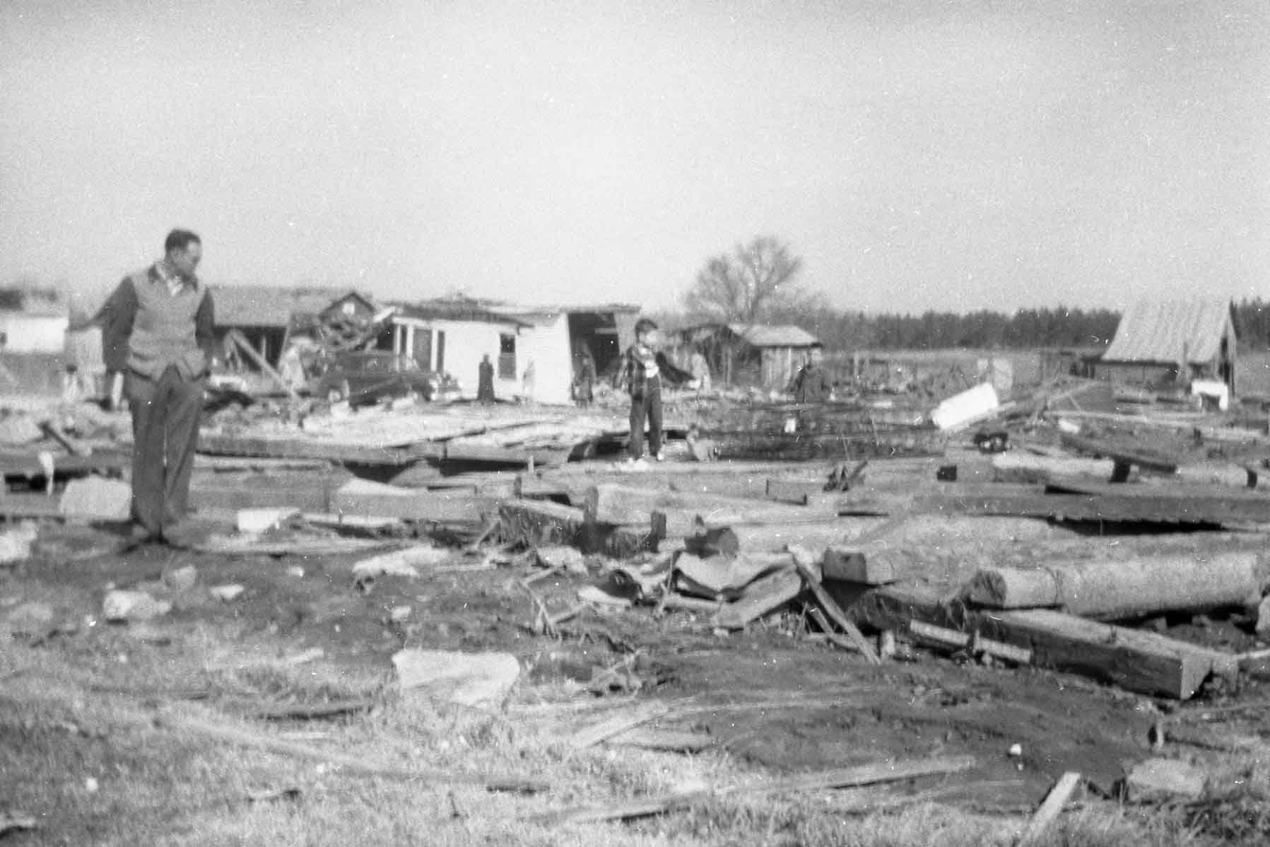 In 1952, my Dad and Mom ,Amon and Velma Bowman my siblings Henry and Sandra and I had just gone to bed when Mother said it sounds like a freight train coming toward the house. When the tornado hit I remember the only thing left was the five of us huddled under a mattress and the rain pouring down and Dad walking to the field to pray for help. God miraculously spared all of us with Dad and Henry receiving minor injuries. Mom began teaching that night “we can never be thankful enough!” God is so good! Wanda Joy Bowman White