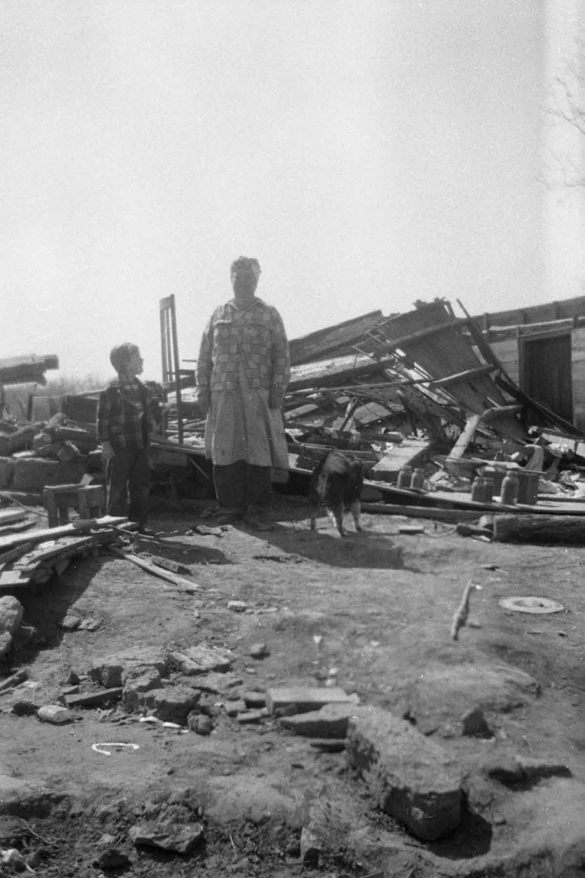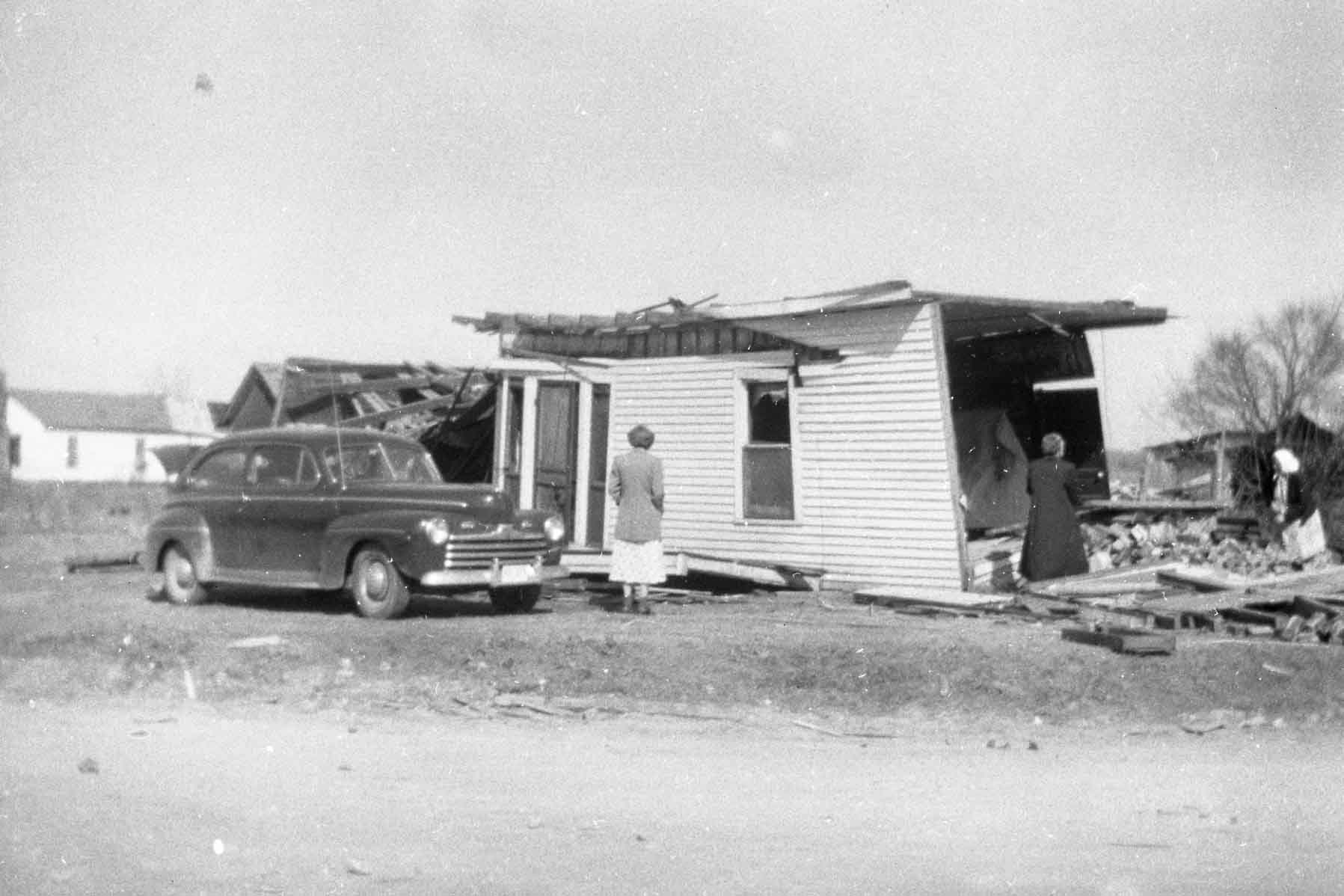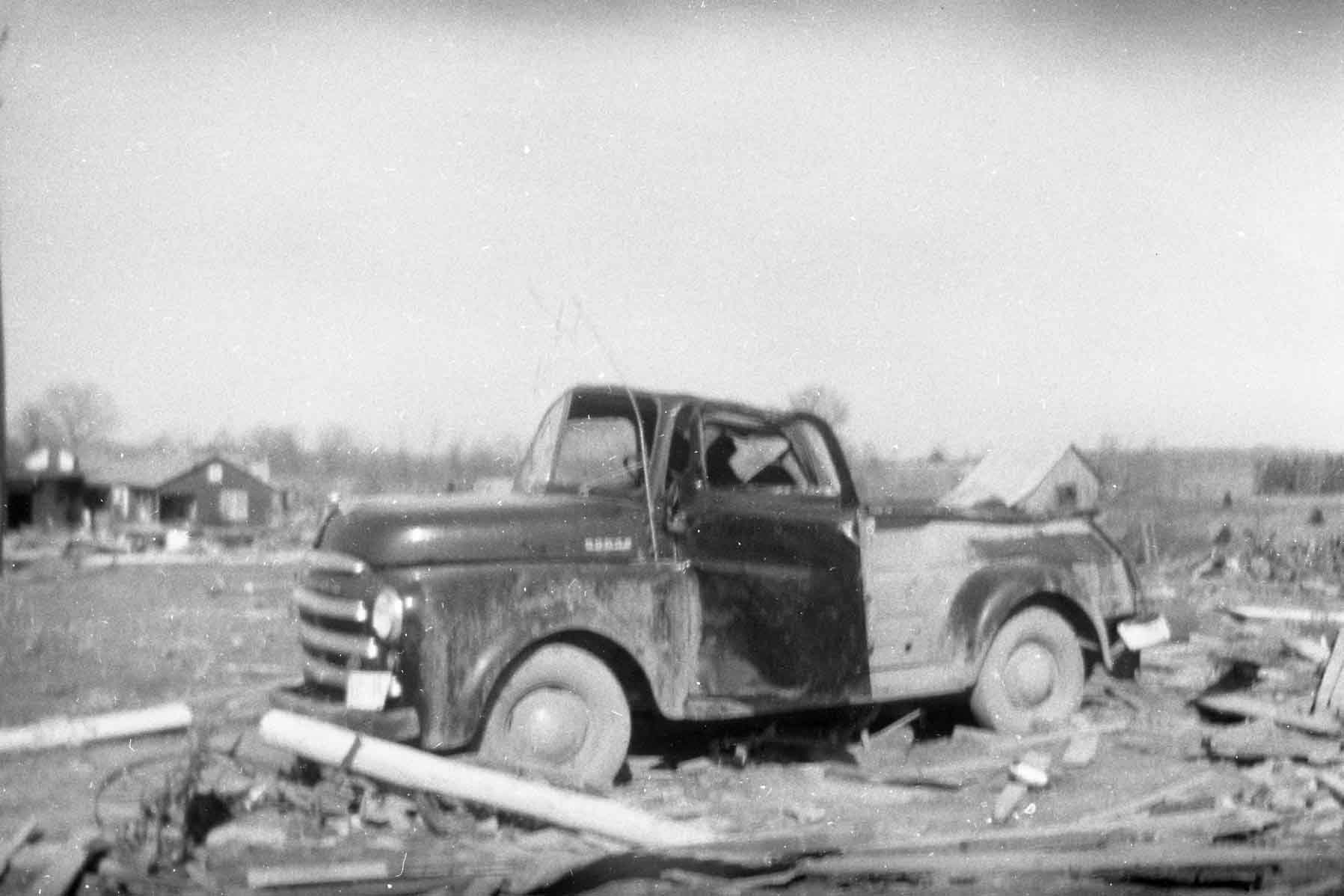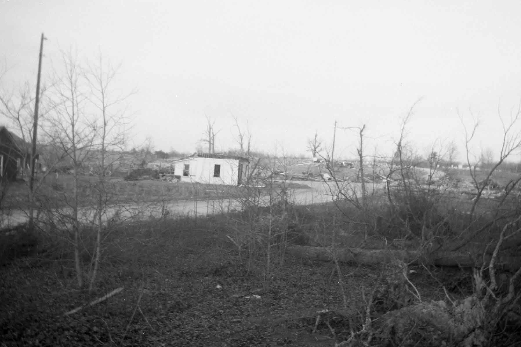 In 1952, my Dad and Mom ,Amon and Velma Bowman my siblings Henry and Sandra and I had just gone to bed when Mother said it sounds like a freight train coming toward the house. When the tornado hit I remember the only thing left was the five of us huddled under a mattress and the rain pouring down and Dad walking to the field to pray for help. God miraculously spared all of us with Dad and Henry receiving minor injuries. Mom began teaching that night “we can never be thankful enough!” God is so good! Wanda Joy Bowman White