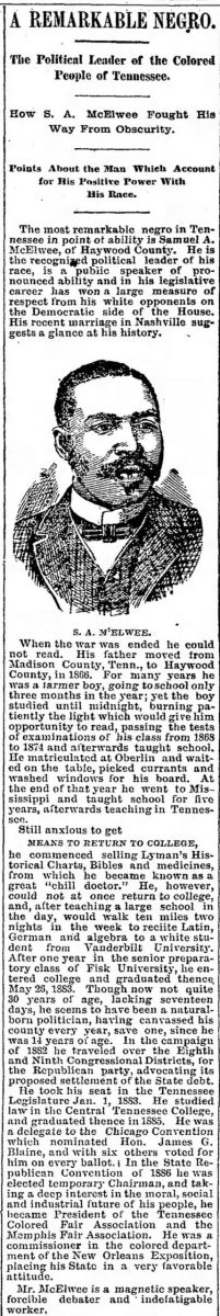 Samuel A. McElwee was born in neighboring Madison County, but his parents moved to Haywood when Samuel was a child. Among his many extraordinary accomplishments, Samuel was elected to the Tennessee Legislature in 1882 and took his seat January 1, 1883.