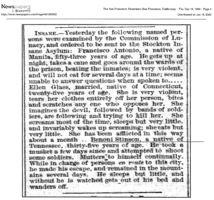 In the 1870 Census of Stockton, California, a Ben Stinson, soldier, age 35, born in Texas, is listed as a resident of the Insane Asylum. The Register for that hospital contains this record: