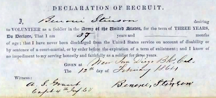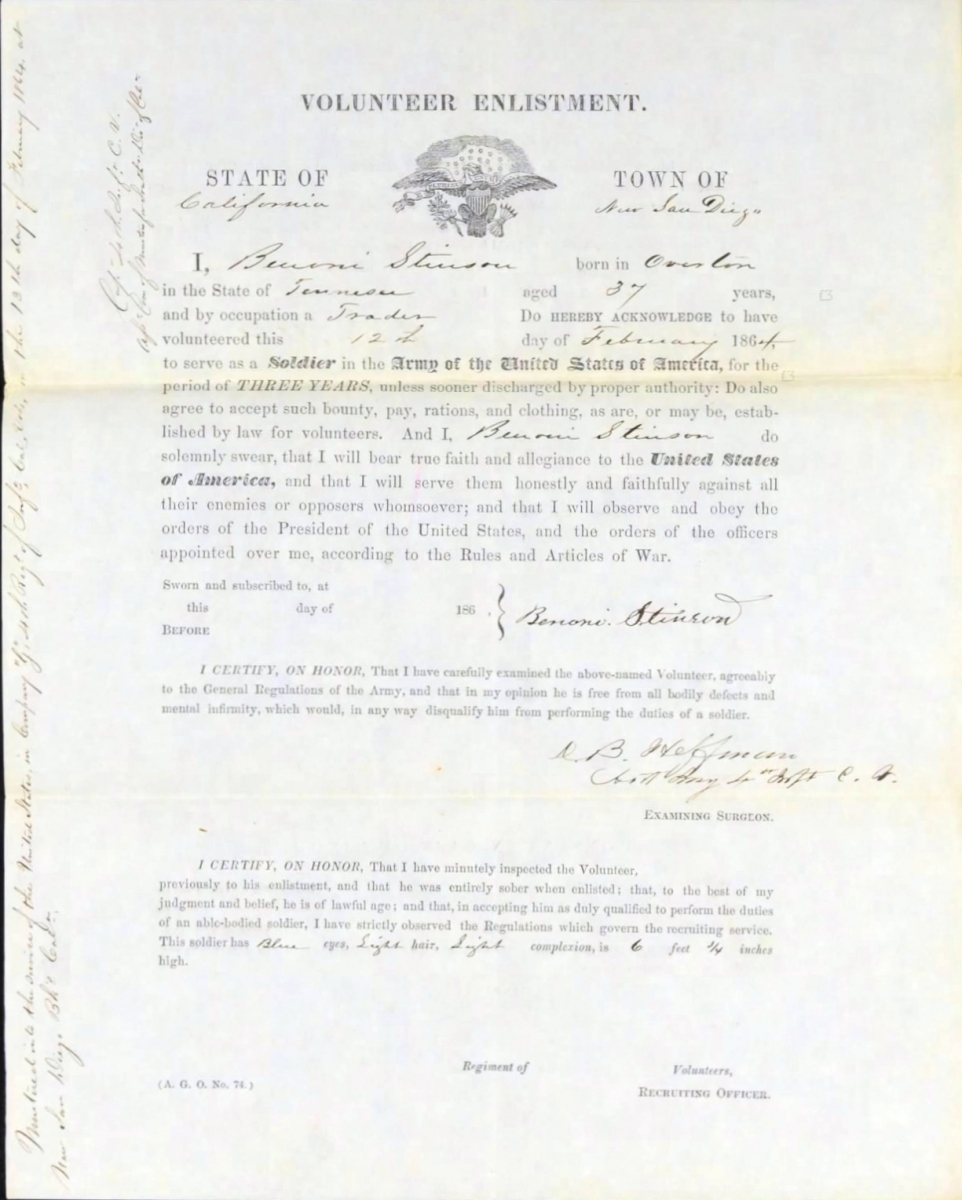 This appears to be Benoni Stinson was in Company G, 4th Infantry, Company G, Union Army during the Civil War from California. He enlisted for 3 years on 7 October 1861 at Auburn, CA. His occupation was “Trader.” He was age 35, height 6 feet, 3/4″, complexion light, blue eyes, light brown hair, born Overton, Tenn.