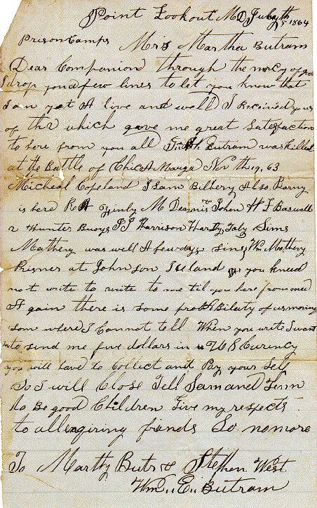 Wm E Butram to Marthy Butram & Stephen West / Point Lookout, MD, Prison Camp 05 Jul 1864
