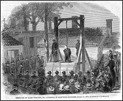 In a trial at Nashville, lasting from 11 July through 26 September, 1865, a military tribunal called witness after unreliable witness against Ferguson, all the while denying his counsel every opportunity to present a competent case in his defense. On 10 October, General Orders affirming his conviction and sentencing him to death by hanging were issued. On Friday, 20 October, 1865, the Order of Execution was carried out while Ferguson’s wife Martha and sixteen year old daughter Ann watched. Thus it came to be that Champ Ferguson joined Henry Wirz, Commandant of the Confederate prison at Camp Sumter (Andersonville) as the only two former Confederate’s of any rank or position to be executed for supposed “war crimes.”
