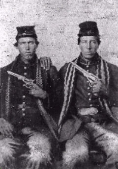 Private William Henderson Ringley on left and Private Solomon Ringley on right Company D, 2nd Tennessee Volunteer Infantry, U.S.A. The Ringleys were brothers from Overton County, Tennessee who were among the approximately 608 soldiers of the 2nd Tennessee captured at Rogersville on November 6, 1863. They were sons of Lewis Ringley. Henderson is holding a Colt Army .36 caliber black powder pistol. Solomon is holding a standard Colt .44 caliber black powder pistol. The scarves around their necks were probably gifts from family members worn in the photo as a sign of affection. Henderson and Sol Ringley survived Belle Isle Prison and in February, 1864 were transported to Andersonville Prison where they died of disease. Henderson died June 15, 1864 and is interred in Grave # 2005. Solomon died September 8, 1864 and is interred in Grave # 8183. About 418 of approximately 608 soldiers captured at Rogersville died of disease at Confederate prisons. Photo courtesy of LTC Ron Cyrus, their great-great nephew // source Dave Matthews 2nd Tennessee Volunteer Infantry Site (archived)