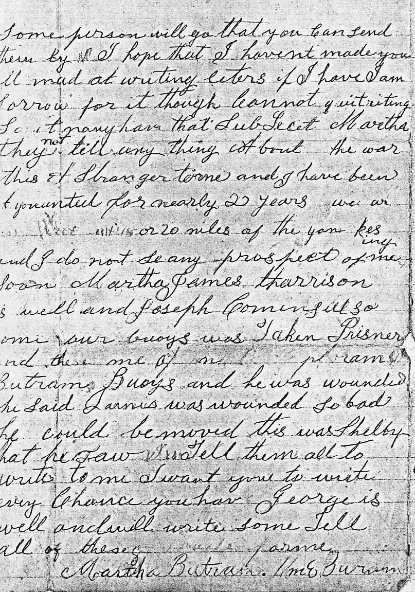 of the river for to keep comisarys in so I must com to a clos this from G W Butram to Jackob Butram if yo hav the opertinnity of writing send your leter to the 25 th reg Stanton Co D a few lines to you all from Wm Butram I am well and well satisfied G W told you enough about th fight with out me saying any thing for trewlar only it was a brave and daring trick again we had a fals allarm and we started of in double qick two