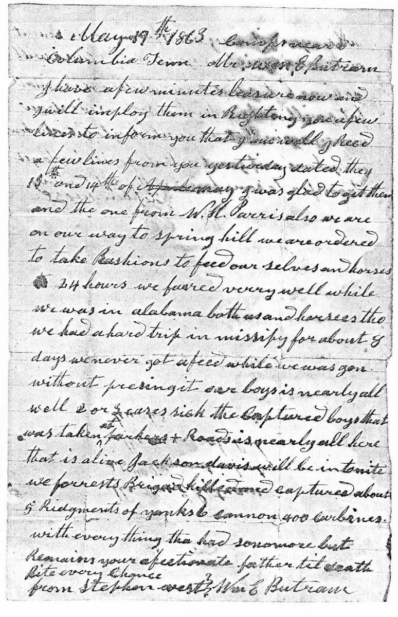 Stephen West to Wm E Butram / Page 1 / Camp near Columbia, TN, 19 May 1863