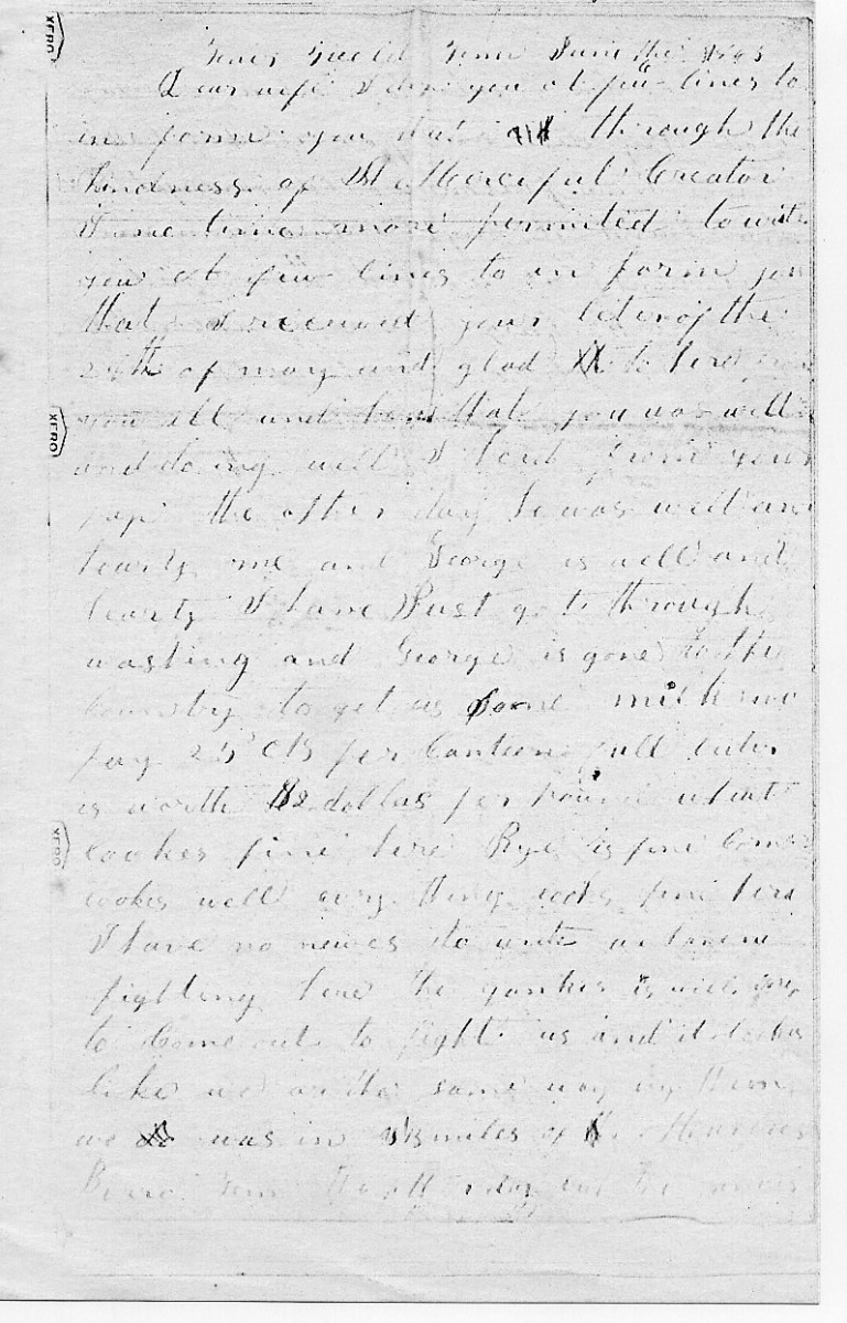 I take the opertwnity of informing yo all that we ar well and I will tel you something of our times our cavalry had a battle th 8 they killed 15 took 15 prisoners this is not mear report fo colonel Stanton commanded the fight I saw the prisoners myself we got one man woonded two horses killed two or three woonded Colonel Stanton is gaining carrector as fast as any oneverdid som say hes a second washington he was commanding his men and thar was a bullet went thro between his fingers between the xx first and second joint he said it burnt rite bad