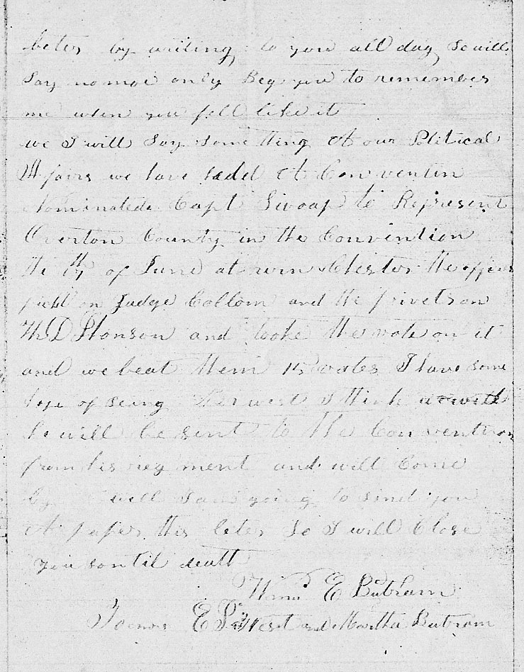 of the river for to keep comisarys in so I must com to a clos this from G W Butram to Jackob Butram if yo hav the opertinnity of writing send your leter to the 25 th reg Stanton Co D a few lines to you all from Wm Butram I am well and well satisfied G W told you enough about th fight with out me saying any thing for trewlar only it was a brave and daring trick again we had a fals allarm and we started of in double qick two