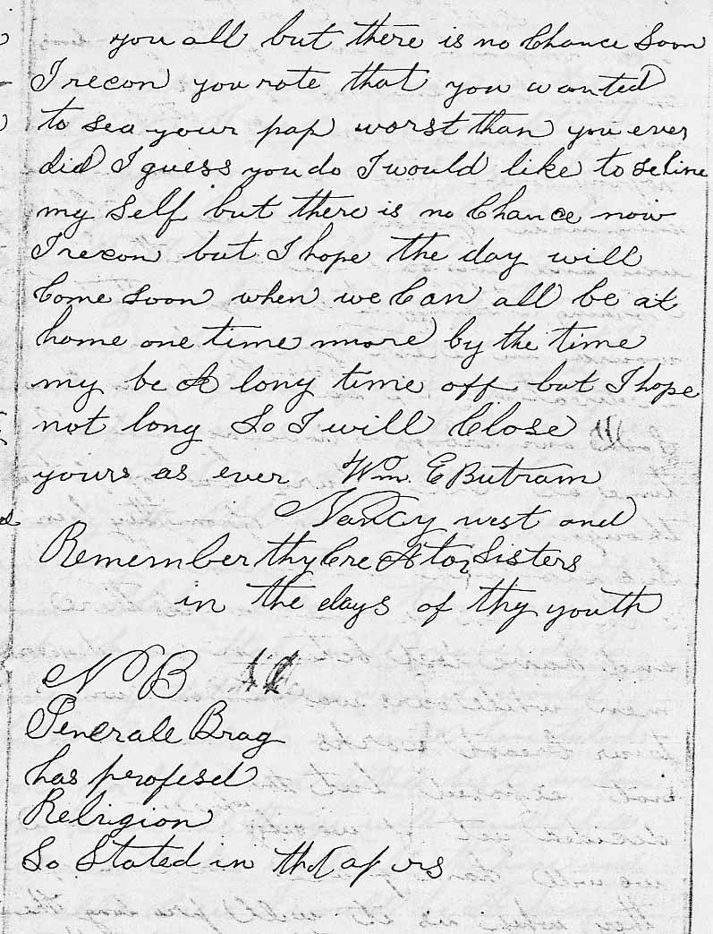 of the river for to keep comisarys in so I must com to a clos this from G W Butram to Jackob Butram if yo hav the opertinnity of writing send your leter to the 25 th reg Stanton Co D a few lines to you all from Wm Butram I am well and well satisfied G W told you enough about th fight with out me saying any thing for trewlar only it was a brave and daring trick again we had a fals allarm and we started of in double qick two