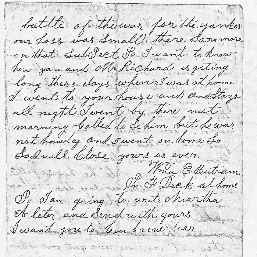of the river for to keep comisarys in so I must com to a clos this from G W Butram to Jackob Butram if yo hav the opertinnity of writing send your leter to the 25 th reg Stanton Co D a few lines to you all from Wm Butram I am well and well satisfied G W told you enough about th fight with out me saying any thing for trewlar only it was a brave and daring trick again we had a fals allarm and we started of in double qick two