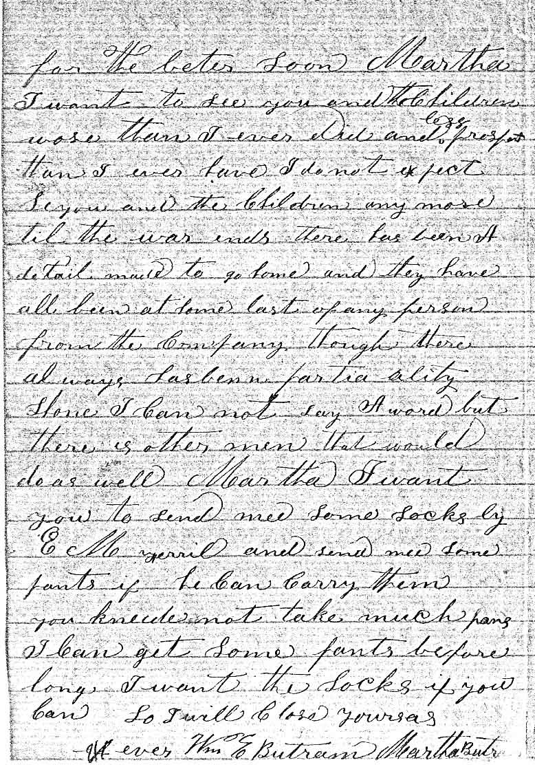 of the river for to keep comisarys in so I must com to a clos this from G W Butram to Jackob Butram if yo hav the opertinnity of writing send your leter to the 25 th reg Stanton Co D a few lines to you all from Wm Butram I am well and well satisfied G W told you enough about th fight with out me saying any thing for trewlar only it was a brave and daring trick again we had a fals allarm and we started of in double qick two