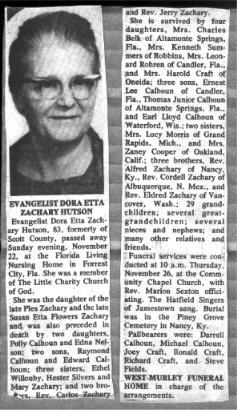 note: Funeral services were held for Betty Zachary at the New River Missionary Baptist Church in Scott Co. TN. Aug. 22, 1989 1:00 P.M. with Rev. Hertis Phillips, Rev. Kermit Phillips and Ira Sexton officiating.