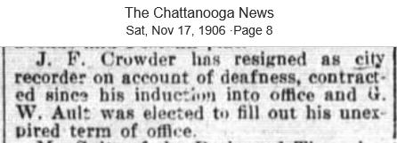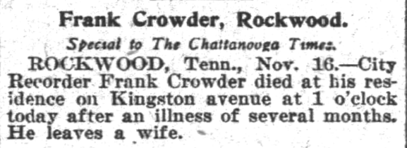 James Frank Crowder married Nette Sanborn in Roane County on 20 April 1905. They apparently had no children. His tombstone inscription at Oak Grove Cemetery in Rockwood indicates his birth and death dates as 13 December 1870 – 16 Nov 1906. He was the son of James and Katie Crowder. Apparently, J. F. Crowder died intestate; Letters of Administration were issued to Nettie Crowder, James L. Nicholas, and Sam. G. Odom on 17 January 1907.