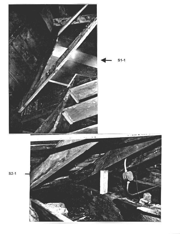 B5: The floor joists on the outside bays of the interior columns appear to span from the interior beam line to the exterior brick walls (it is not known at this time if these joists are also separated at the interior beams). The joist bear on small wood plates at the brick wall (S2-6) and extend over the wall to support the roof rafters. While we did not observe any positive connection of the joists to the wall, we did notice structural steel straps with steel rods and turnbuckles extending to a steel angle that has been strapped to the ceiling joists of the porches on the north and south sides (S2-7). The design of the straps appear to be for the support of the porch framing instead of anchorage for the attic floor and main roof framing. This also requires the brick wall to be supported laterally by the friction of the wood framing on top of the wall only. Since the walls are constructed of multi-wythe brick (which has very little continuity) gauge metal anchor plates may provide the necessary connection requirements for load transfer. These joists are also the members mentioned in Item B1.
