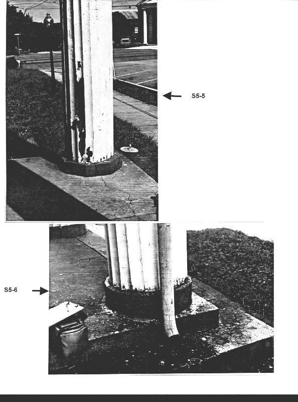 E2: Although the 24″ diameter columns may not support the porch roof framing, photographs taken during the 1976 renovation indicate the columns do support the balcony framing. The finished ceiling of the balcony (S5-2) and roof (S5-3) on the south porch displayed severe signs of member decay and failure at the columns. The north porch balcony was repaired in 1976 but is currently experiencing damage to the finishes and possibly the structural members (S5-4). All of the 24″ diameter columns are or have experienced moderate to severe decay (S5-5 & S5-6).