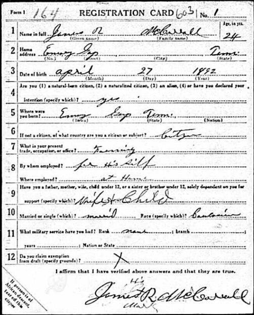 Jimmy McCarroll's U.S. World War I Draft Registration Card
