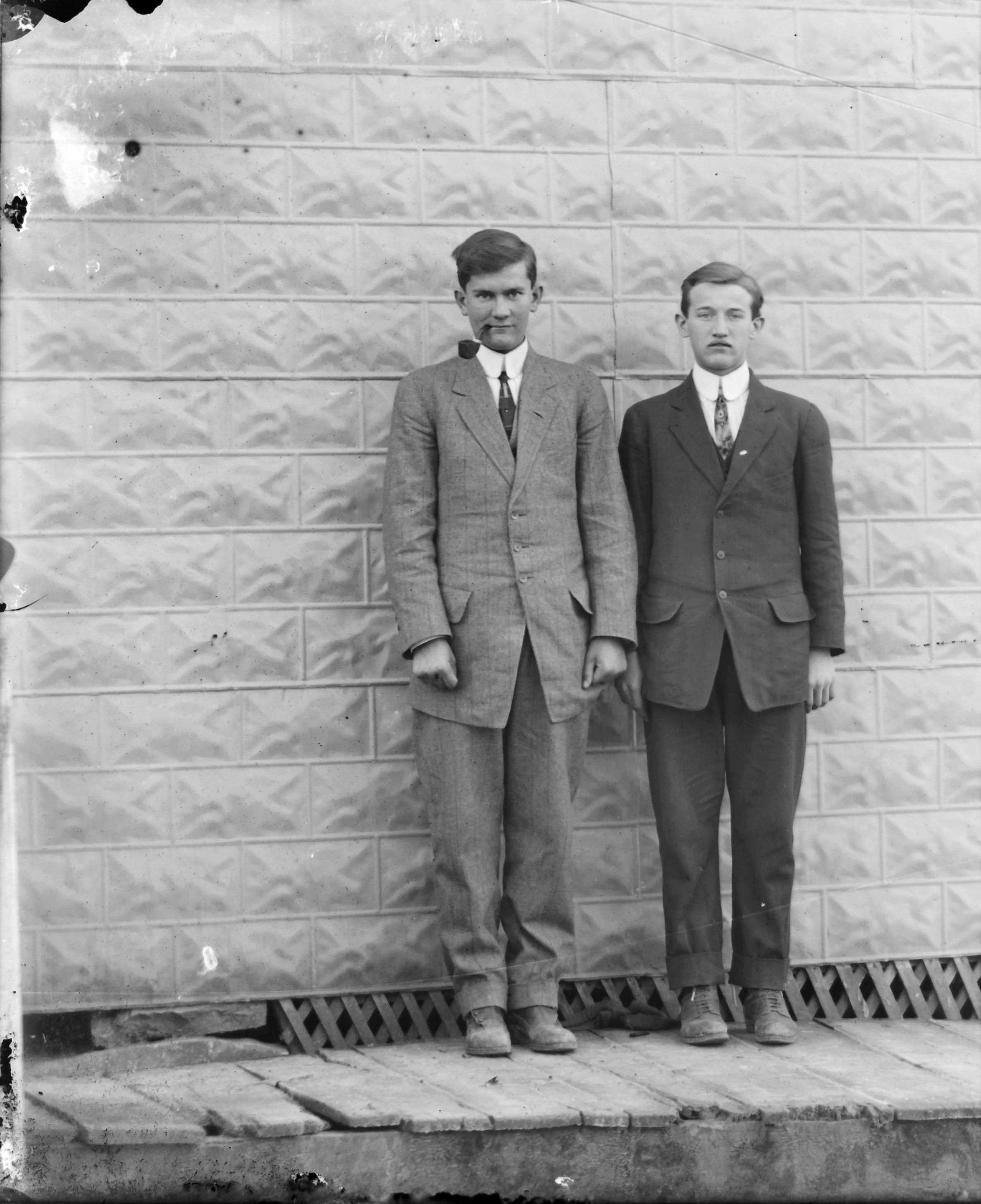 2 males, one smoking a pipe next to bldg
