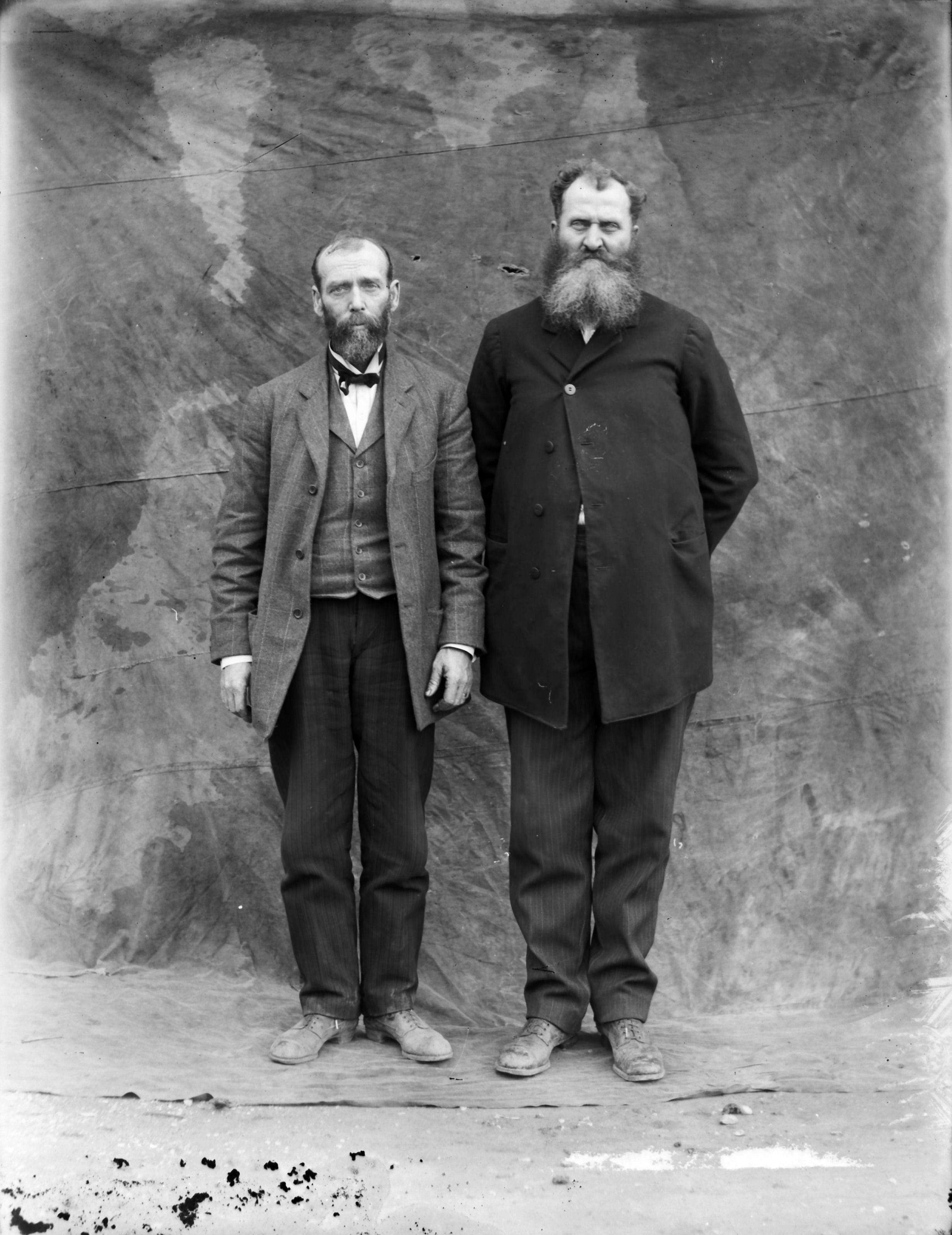 2 older, bearded males next to bldg