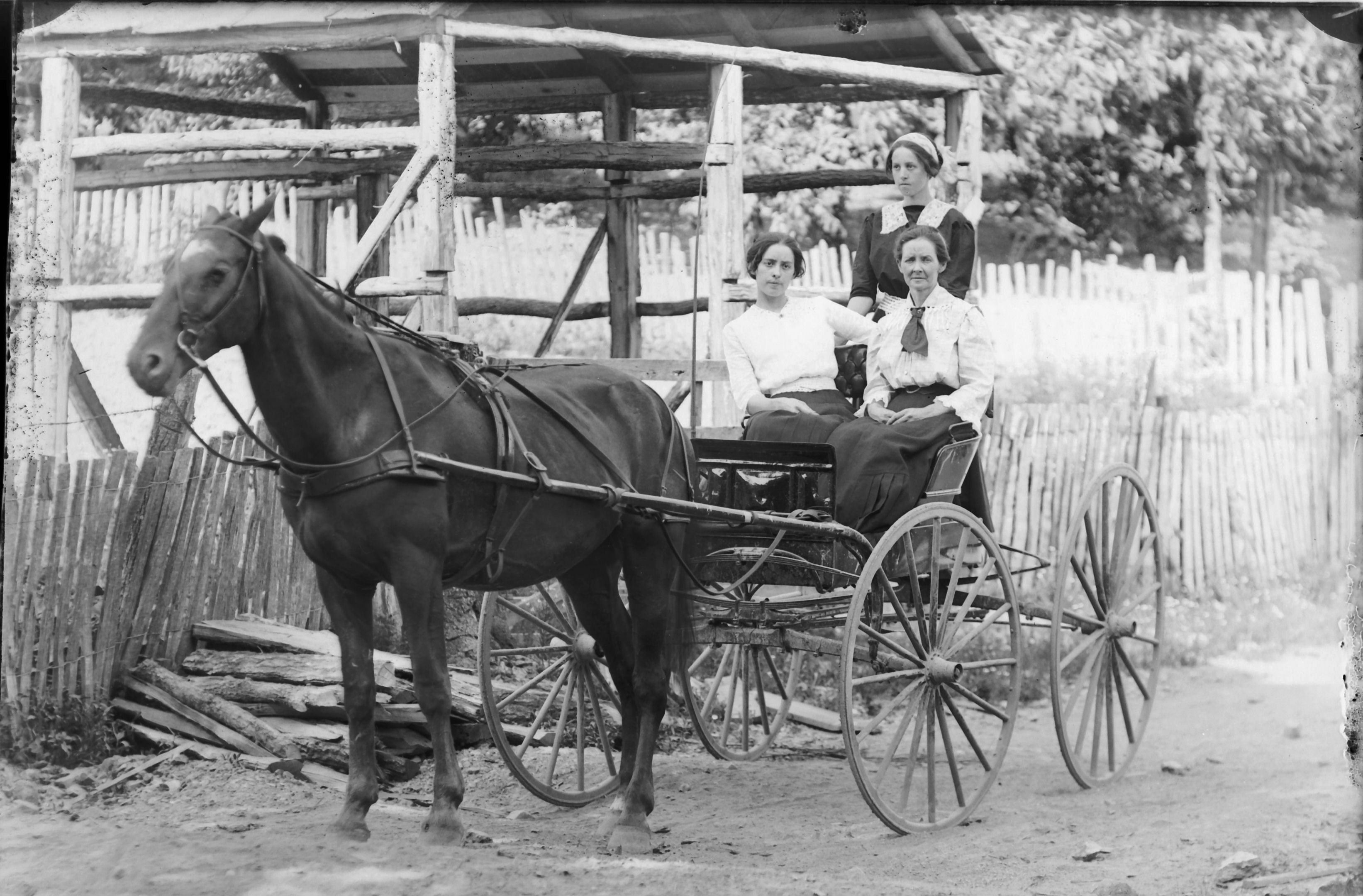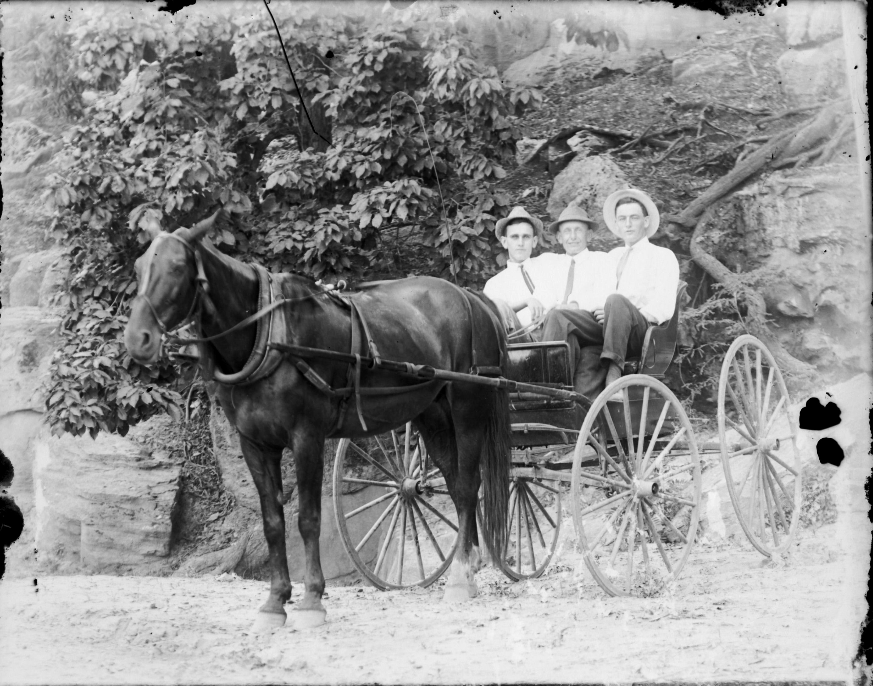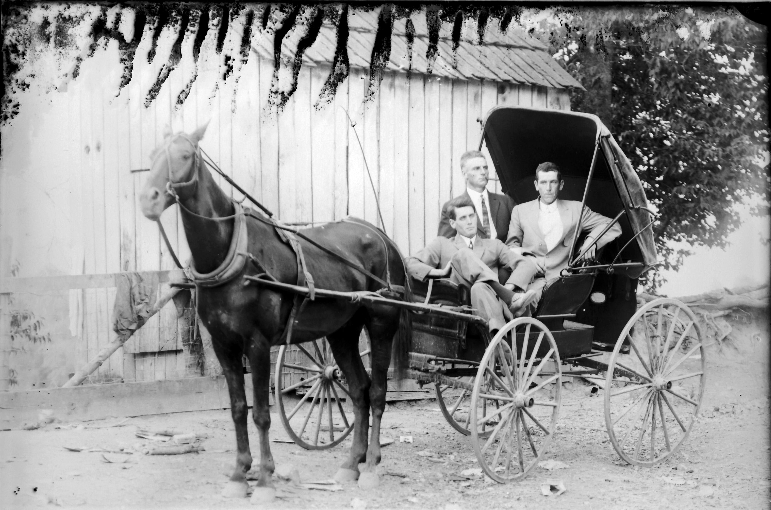 2 males in horse drawn buggy