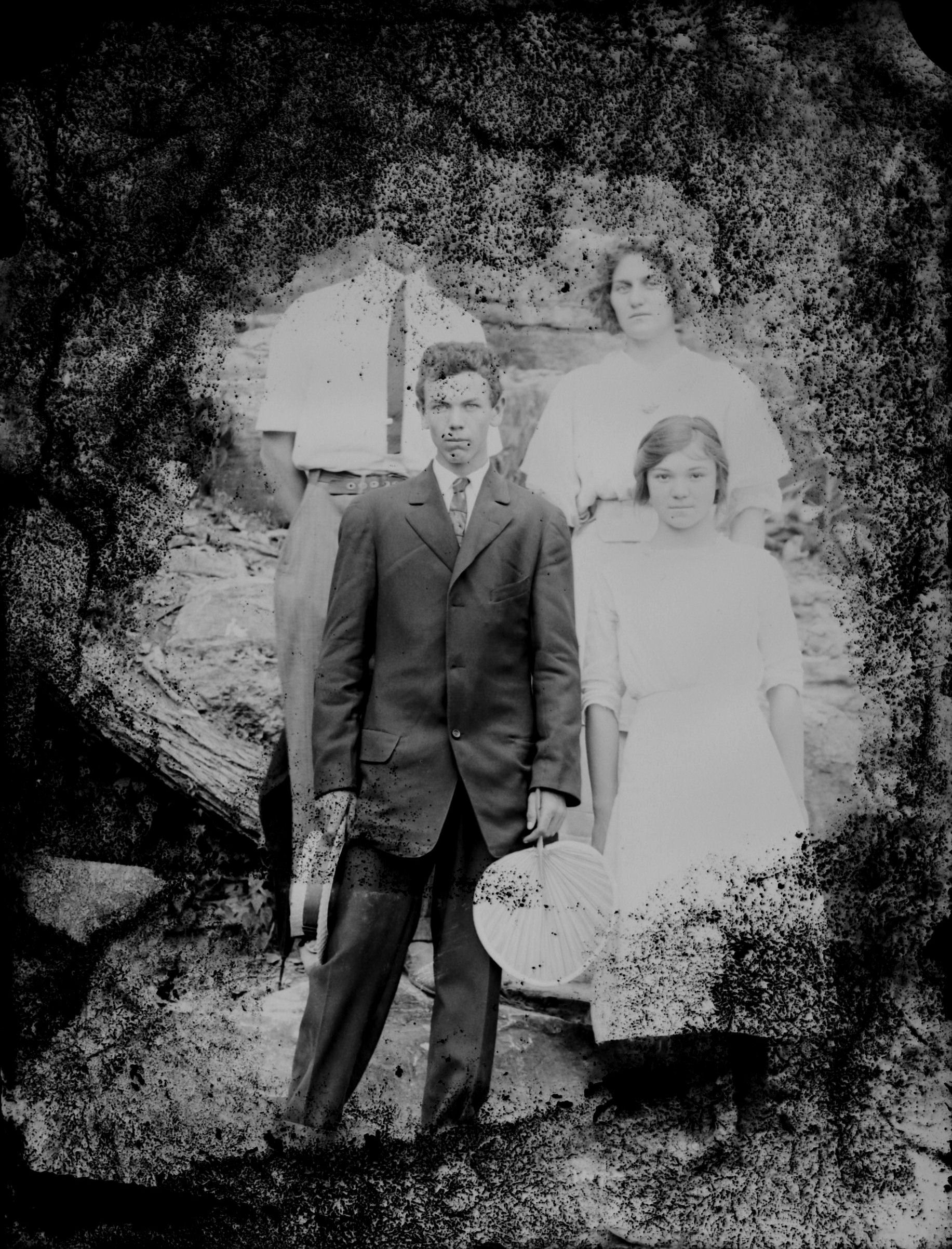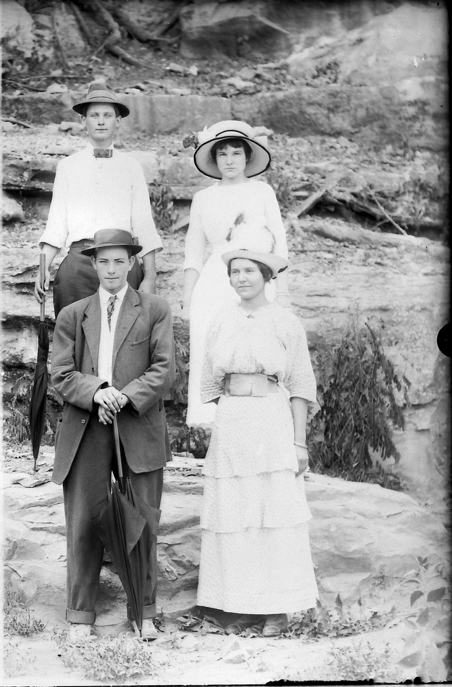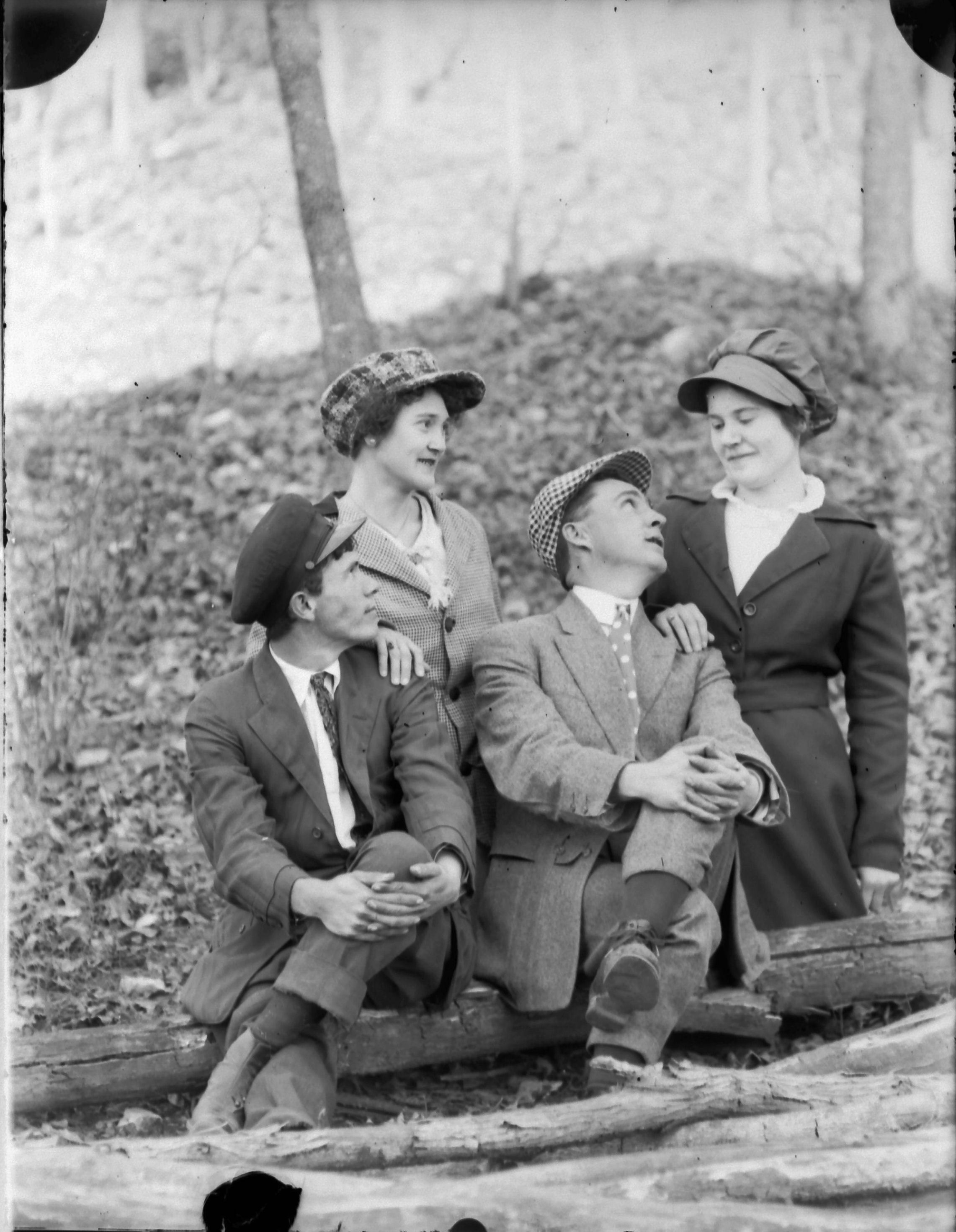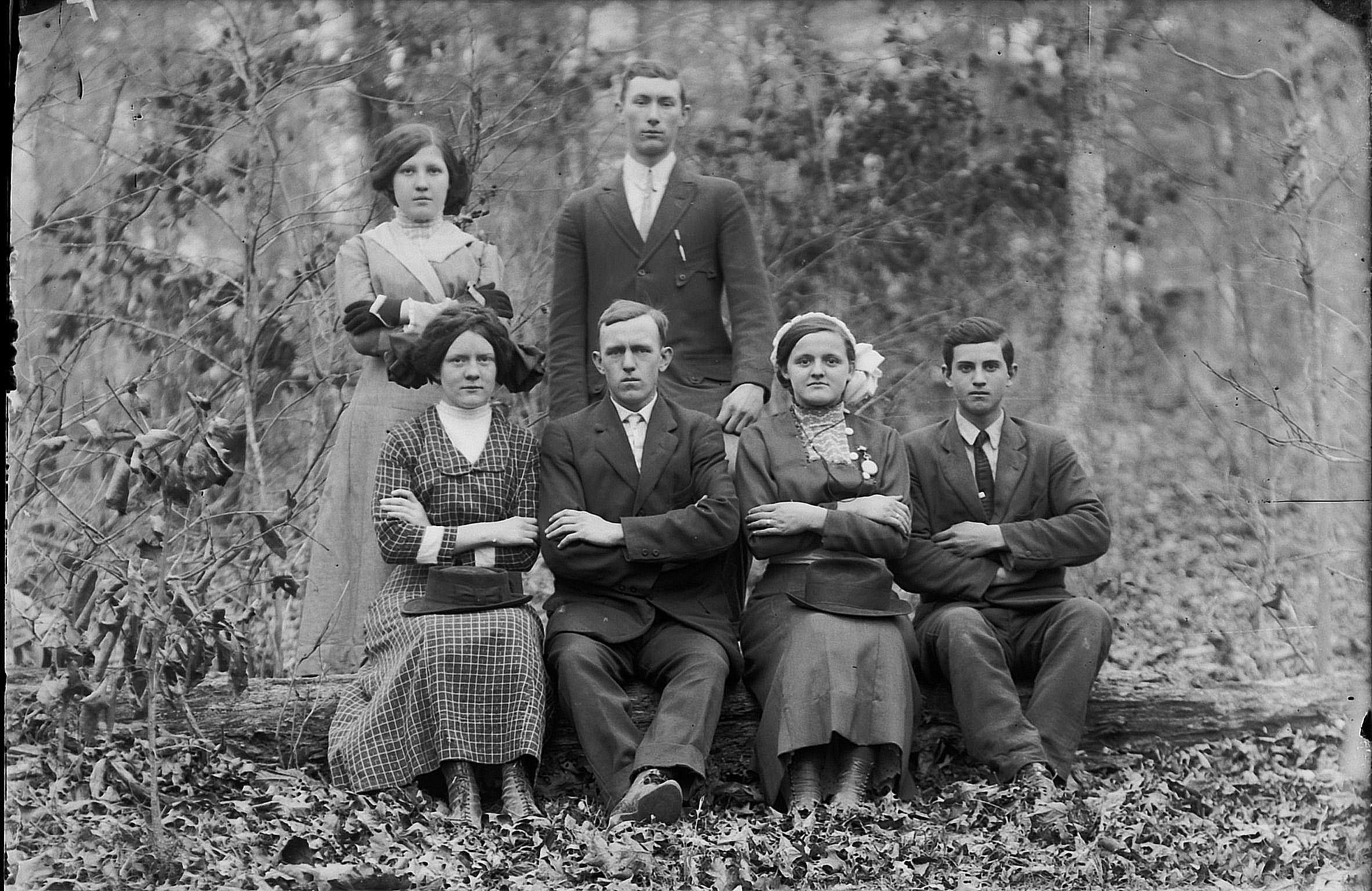 front row Nannie Earl (Morgan) Vick, male, Maggie (Clinard) Milton, Herbert Ervin Milton Sr in woods