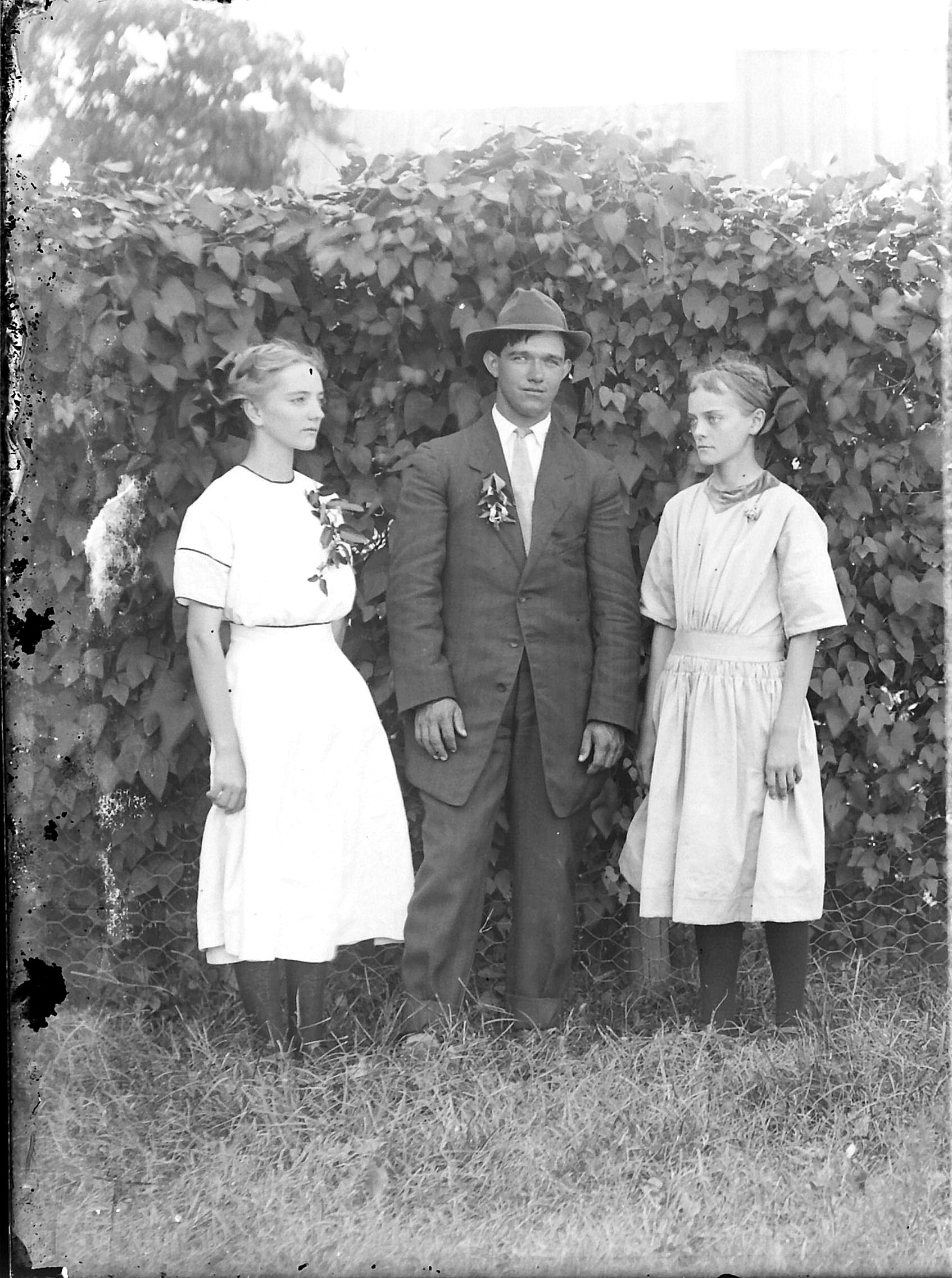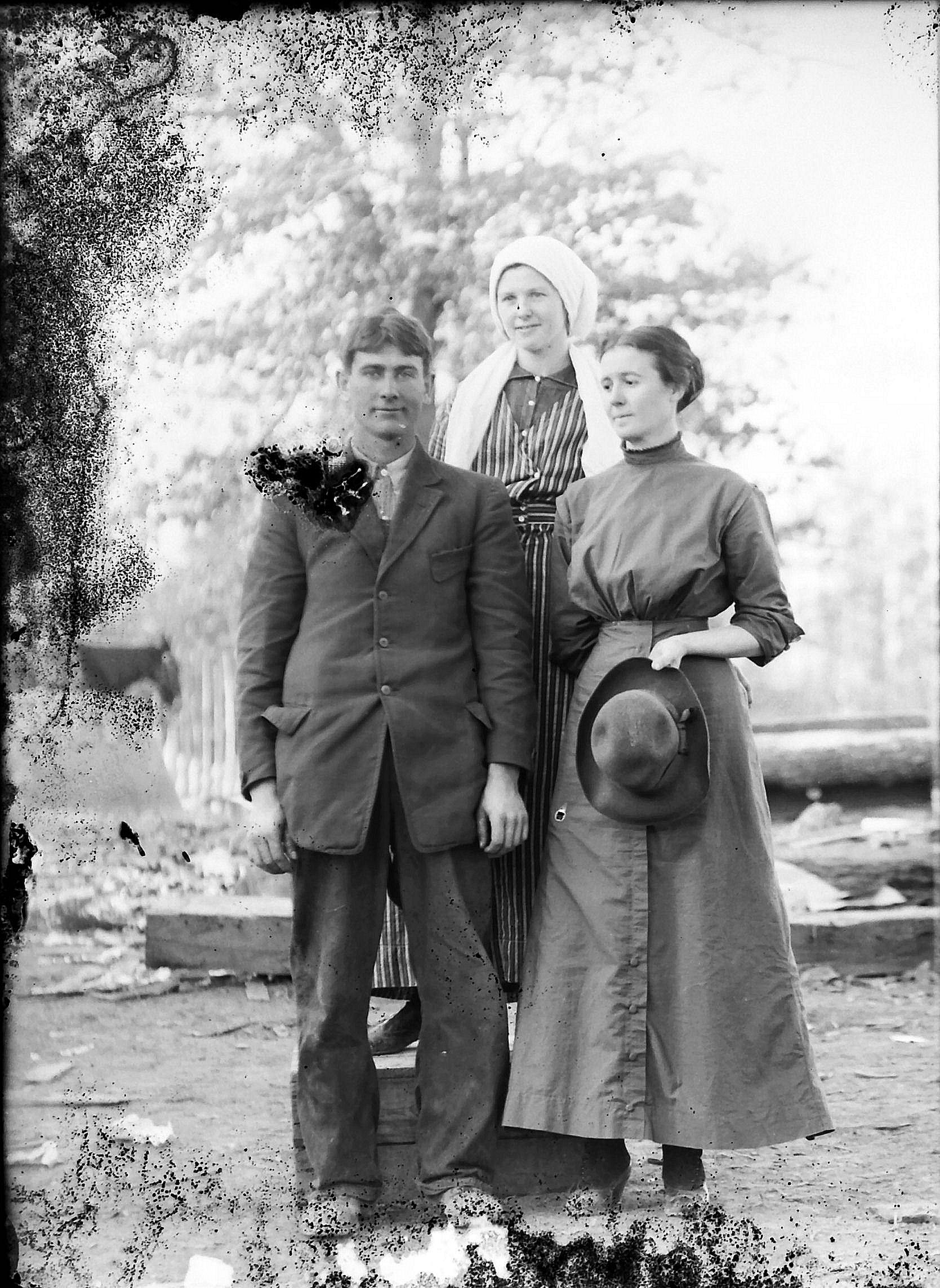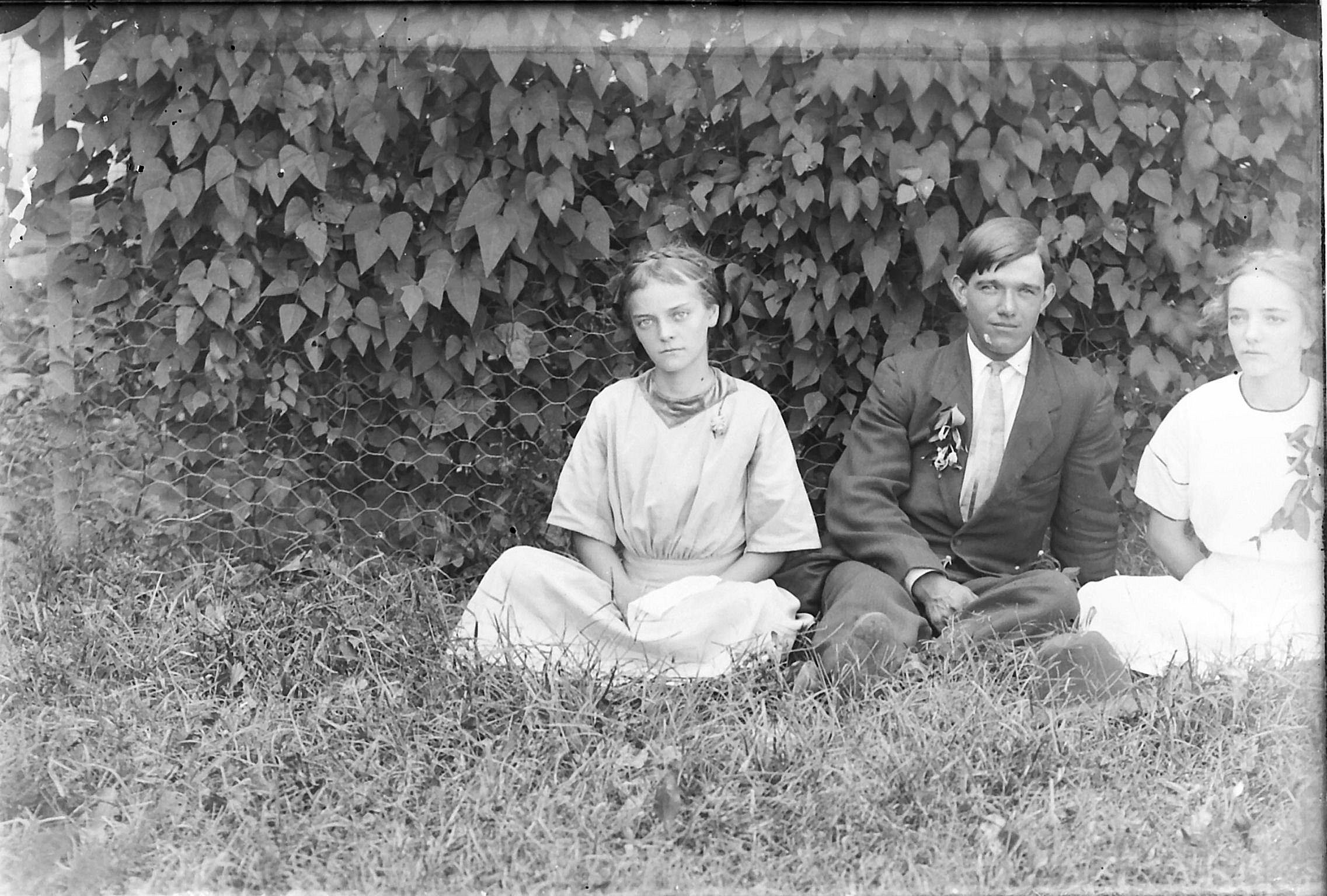 back Sarah Earheart, front Lawrence S & Maude Ross Williams in yard