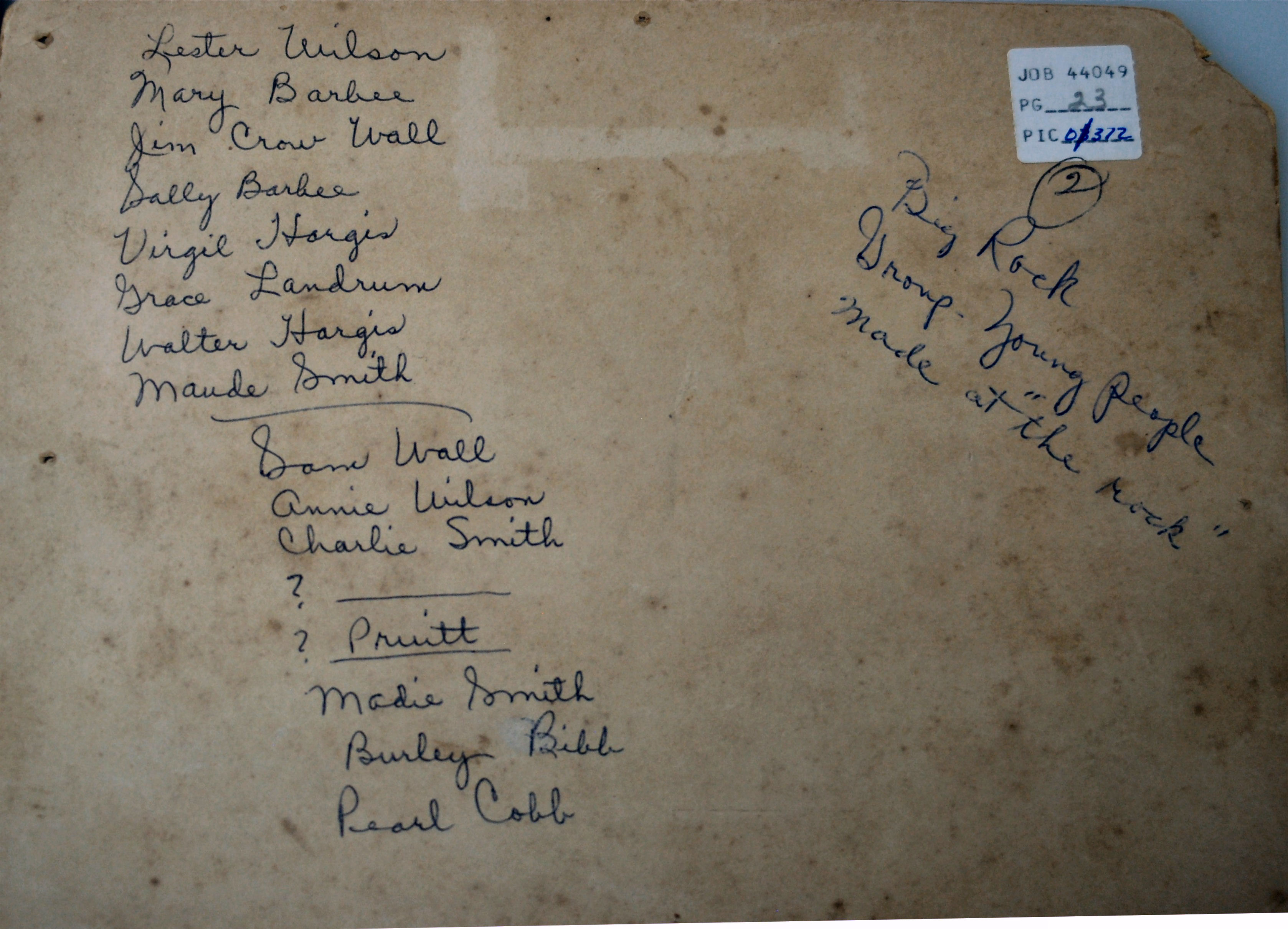 Back row: Lester Wilson, Mary Barbee, Jim Crow Wall, Sally Barbee, Virgil Hargis, Grace Landrum, Walter Hargis, Maude Smith