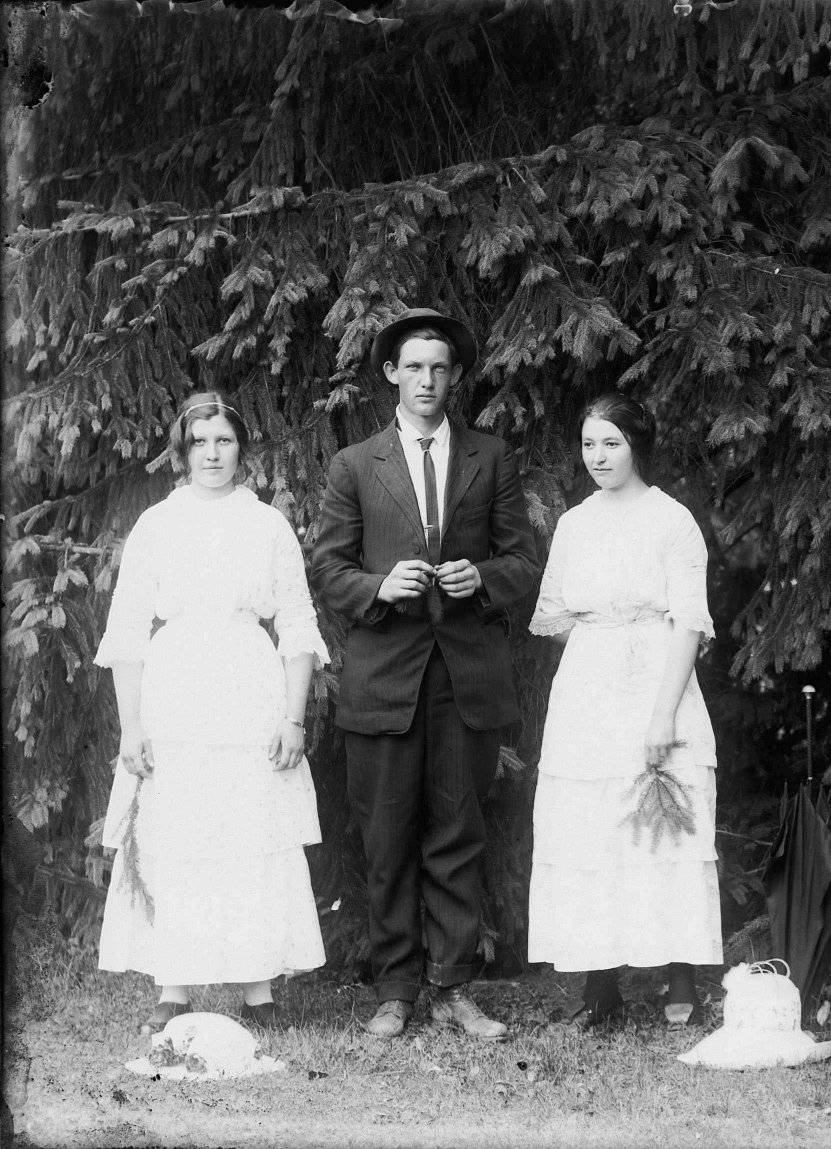1 male, 2 females in front of pine tree