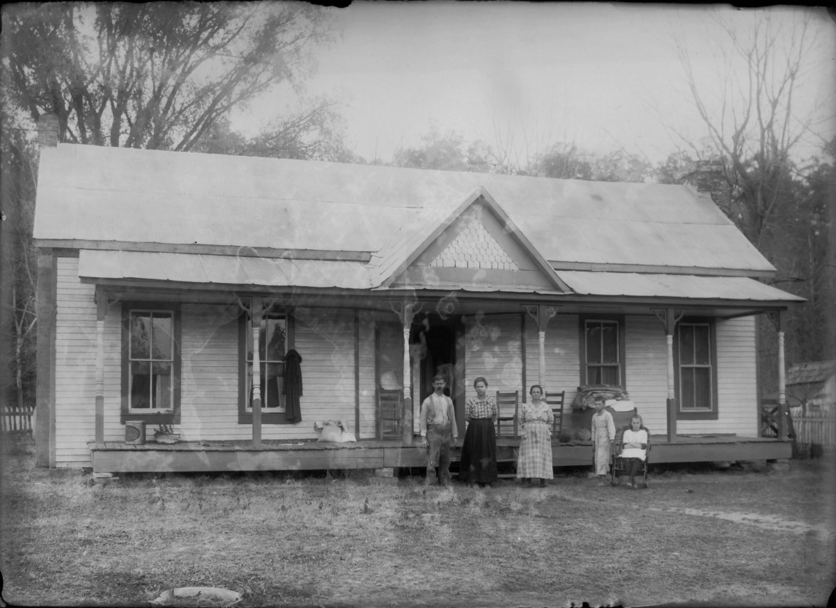 new house with family on porch, middle Amanda Feltner?, right side Sam Jr, Mary C & Mamie Jarman Feltner