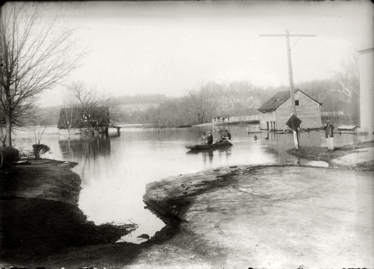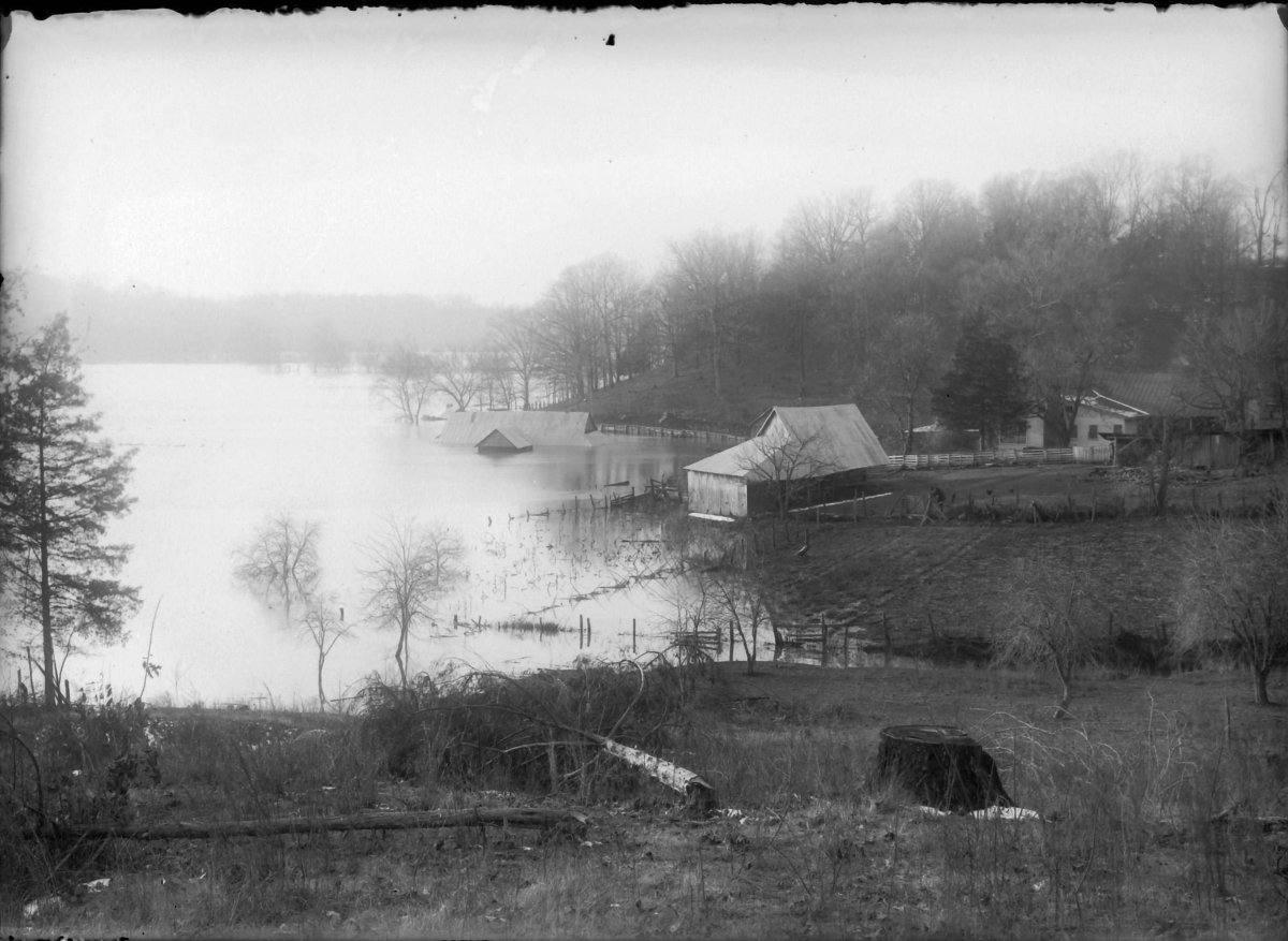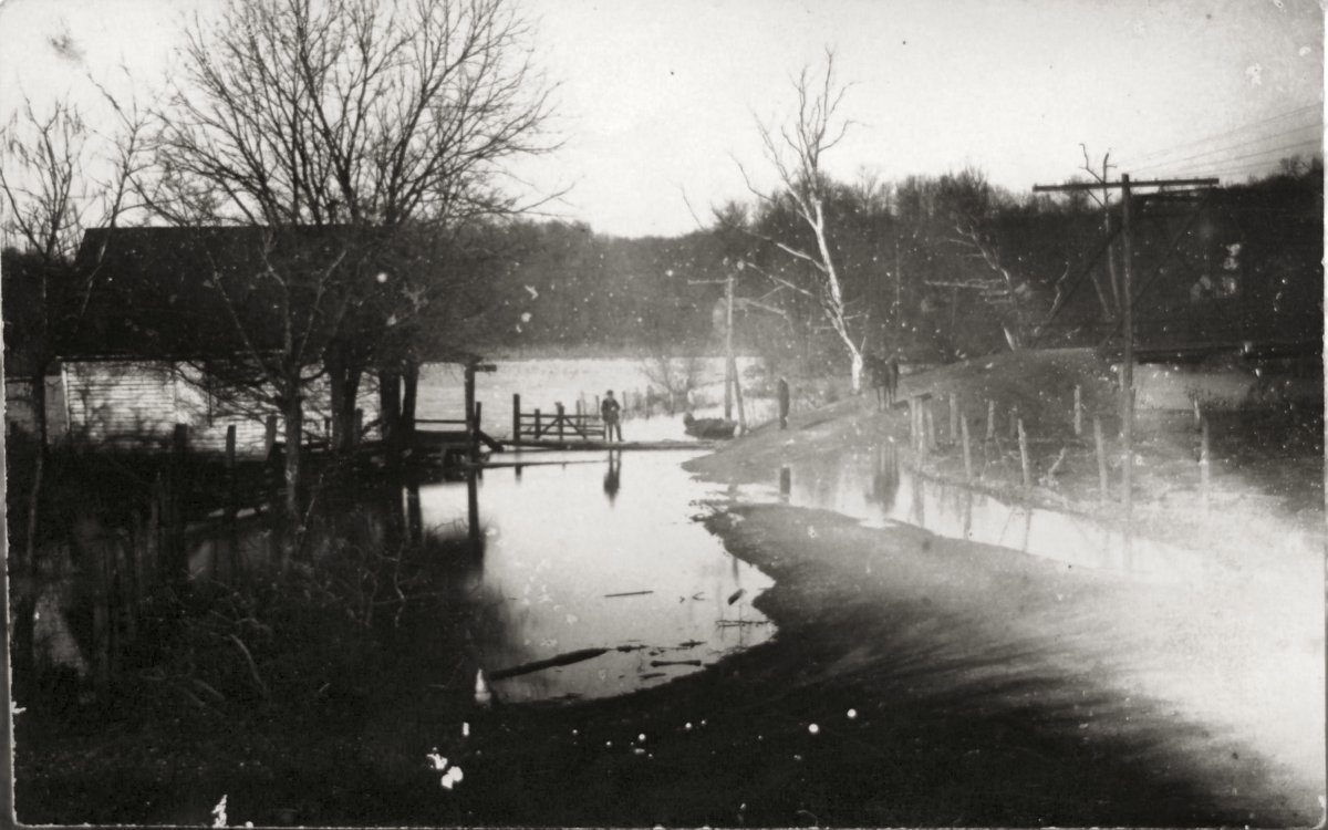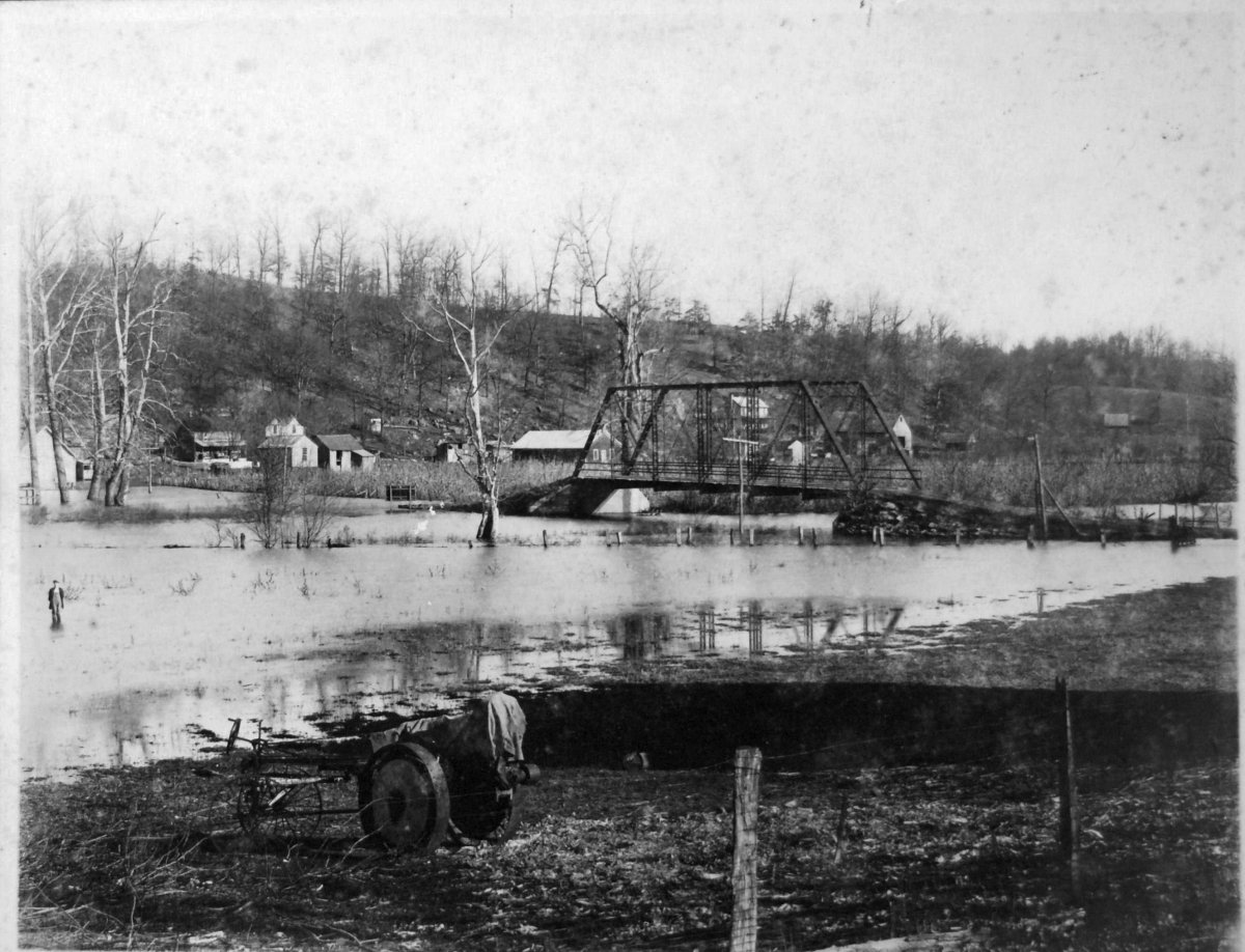 early Saline Creek flood in Bumpus Mills; note old iron bridge that was destroyed in 1928