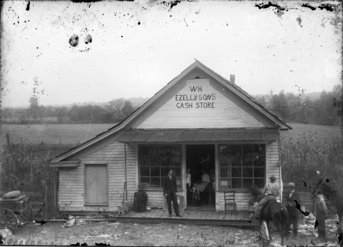 W H Ezell & Sons store, Henry G Ezell standing on porch