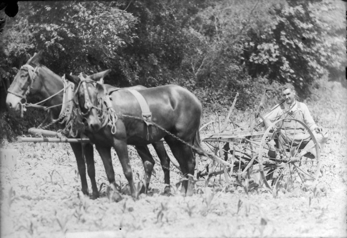 Jeff William Page on a mule drawn cultivator, see M km-53