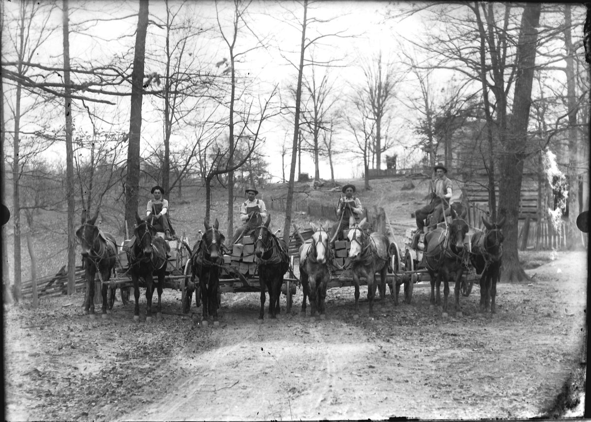 Four mule drawn wagons hauling RR ties - Bernard Clinard, Roy Clinard, James Alexander Clinard and Will Young