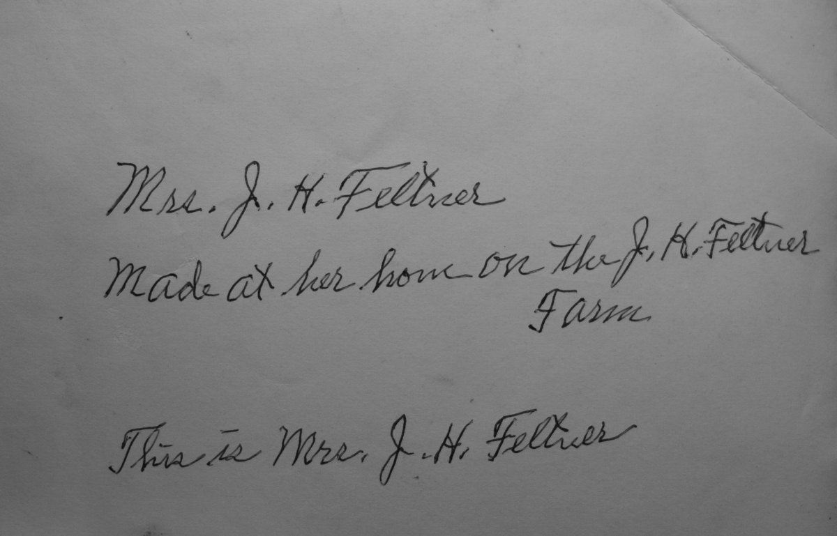 inscription “Mrs J H Feltner, made at her home on the J H Feltner Farm. This is Mrs J H Feltner”