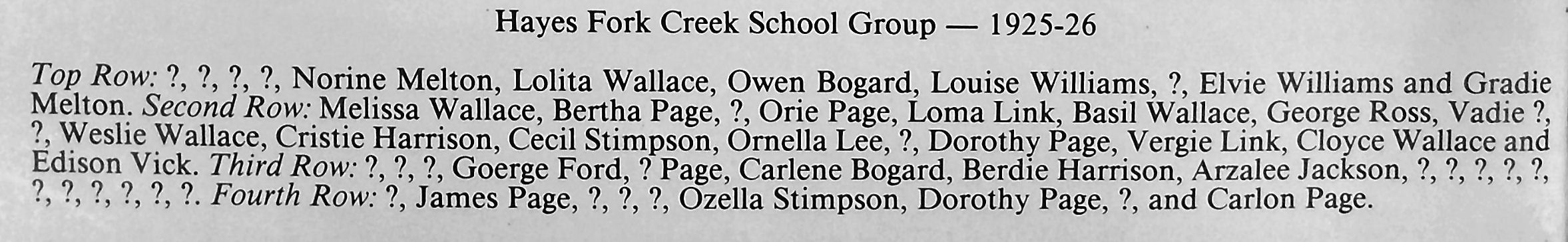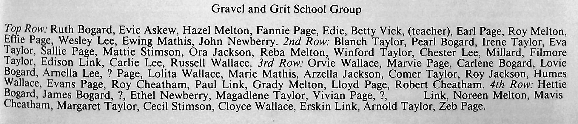 3rd row: Orvie Wallace, Marvie Page, Carlene Bogard, Lovie Bogard, Arnella Lee, ____ Page, Lolita Wallace, Marie Mathis, Arzella Jackson, Comer Taylor, Roy Jackson, Humes Wallace, Evans Page, Roy Cheatham, Paul Link, Grady Melton, Lloyd Page, Robert Cheatham