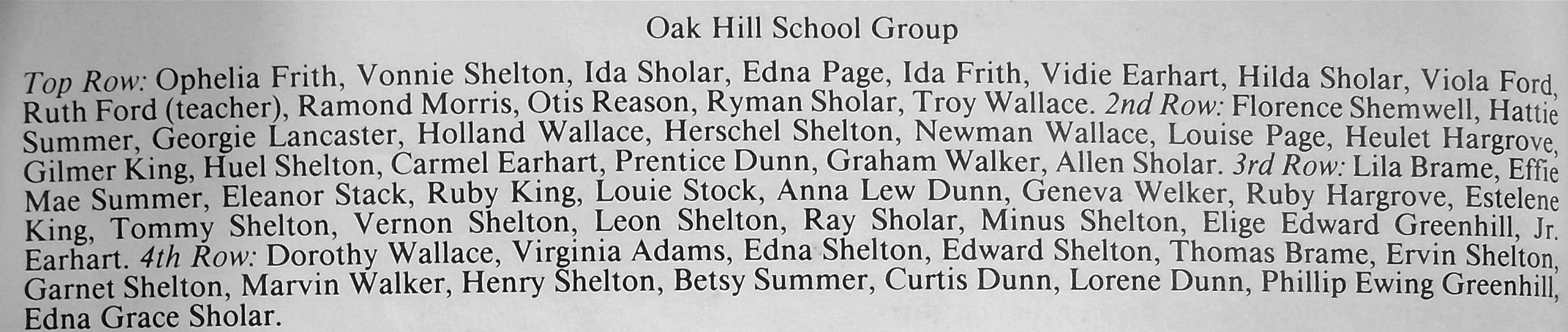 4th row: Dorothy Wallace, Virginia Adams, Edna Shelton, Edward Shelton, Thomas Brame, Ervin Shelton, Garnet Shelton, Marvin Walker, Henry Shelton, Betsy Sumner, Curtis Dunn, Lorene Dunn, Philip Ewing Greenhill, Edna Grace Sholar
