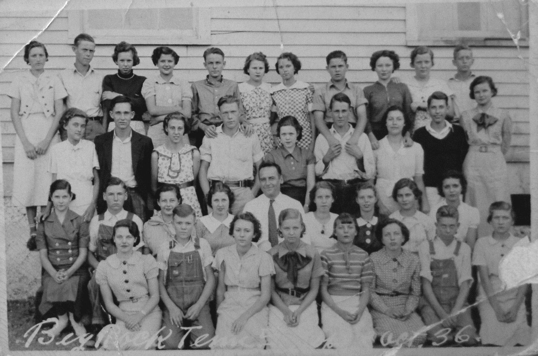 Top row: ?, ?, ?, ?, Norine Melton, Lolita Wallace, Owen Bogard, Louise Williams, Claudia Wallace (teacher), Robert Taylor (teacher), Elvie Williams, Grady Melton