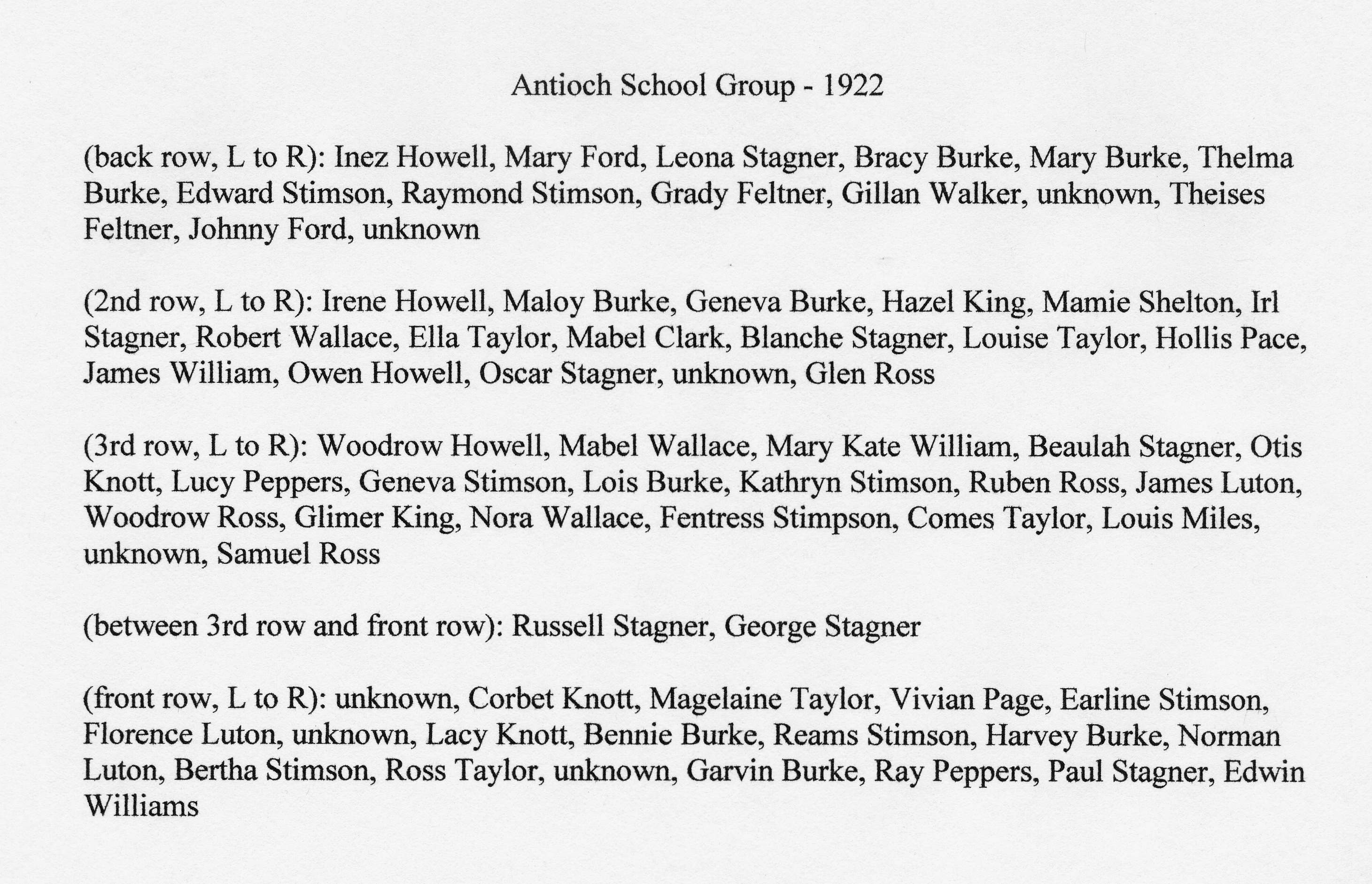 Third Row: Ewing Feltner, Jessie Stimson, Robert Stagner, Oscar Knott, Birdie Burke, Fred Stagner, Tommy Stimson, Henry Williams, Ray Stimson, Warren Stimson, Willie Knott
