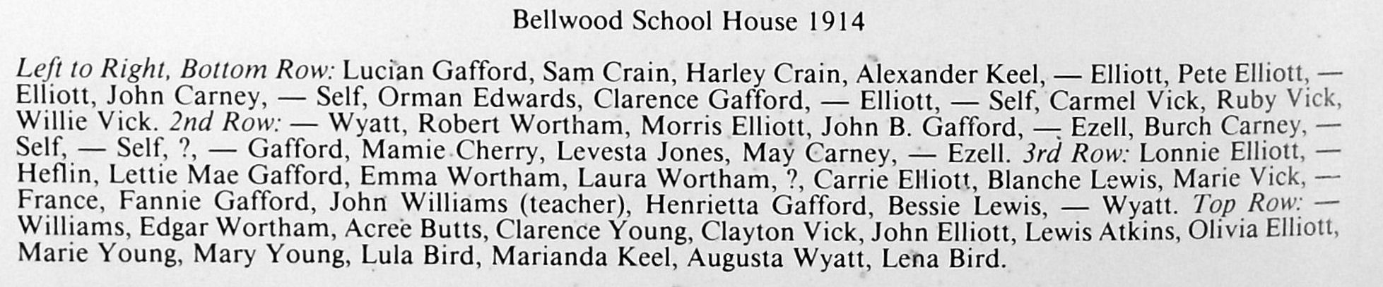 3rd row – Willie Francis, Rogers Carr, Ewing Shemwell, Irving Shemwell, Alec Dunn, Earl Francis, Lizzie Walker, Mary Dunn, Rosie Sowell, Etheline Walker, Dessie McCain, Nancy Walker, Lexie Walker, Gustie Walker, Myrtle Joiner, Birdie Francis