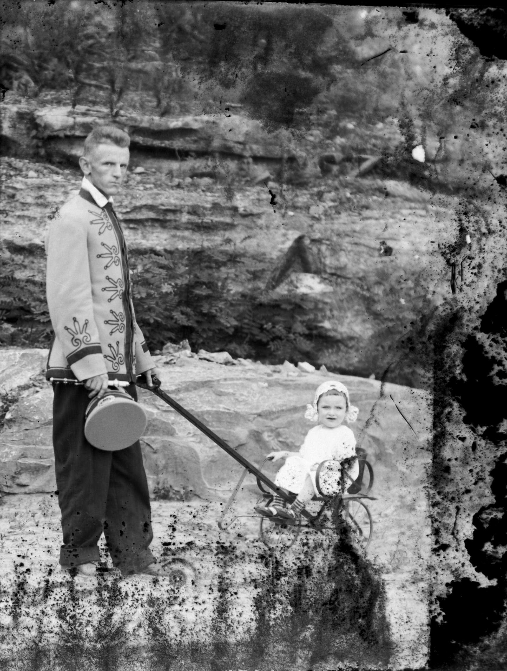 Elmer Holland, piccolo player with child in stroller, Big Rock