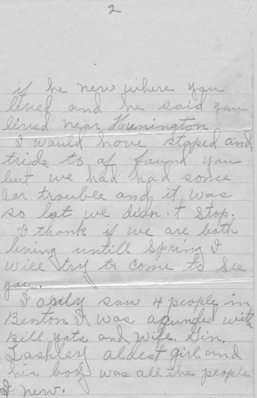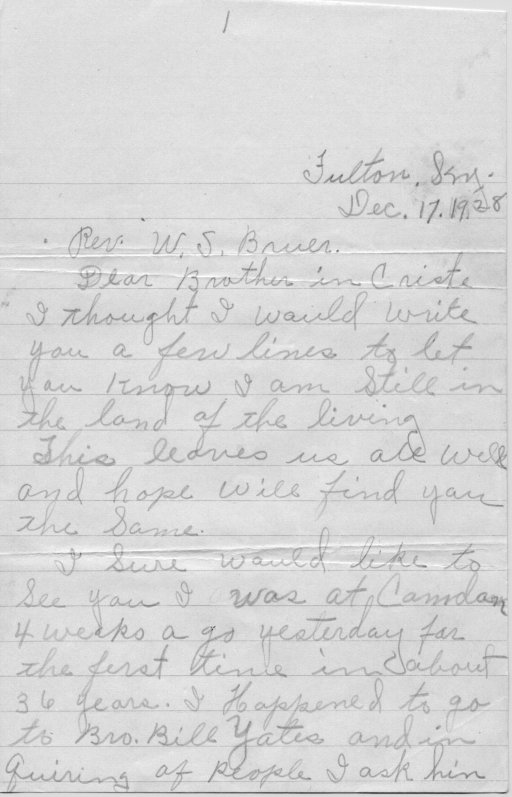 I sure would like to see you I was at Camdan 4 weeks ago yesterday for the first time in about 36 years. I happened to go to Bro. Bill Yates and in quiring of people I ask him if he new where you lived and he said you lived near Hunington. I would hav stoped and tried to of found you but we had had some car trouble and it was so lat we didn't stop. I thank if we are both living untill Spring I will try to come to see you.