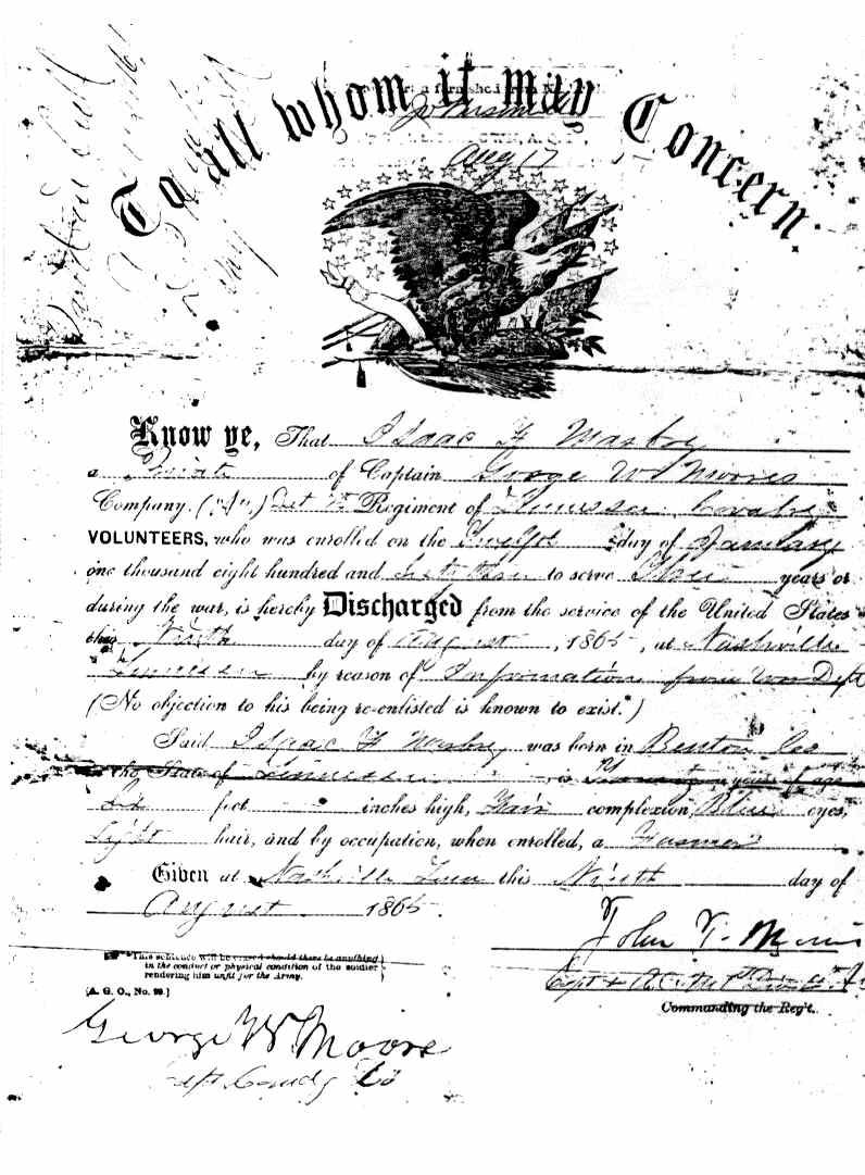 James F. Smothers was captured near Trenton, TN by the Confederate 7th Tennessee Cavalry led by General N.B. Forrest on 20 December 1862. However, he was paroled the same day and reassigned to Company C of the 7th Tennessee Cavalry, U.S.A. since there were only enough men to form four companies of those return by parole. James Franklin Smothers remained with this regiment until discharged 15 July 1865 and returned to his family in Benton County, TN.