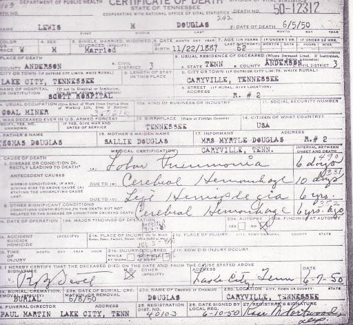 Place of Death: Scott Hospital, Lake City TN, Anderson County